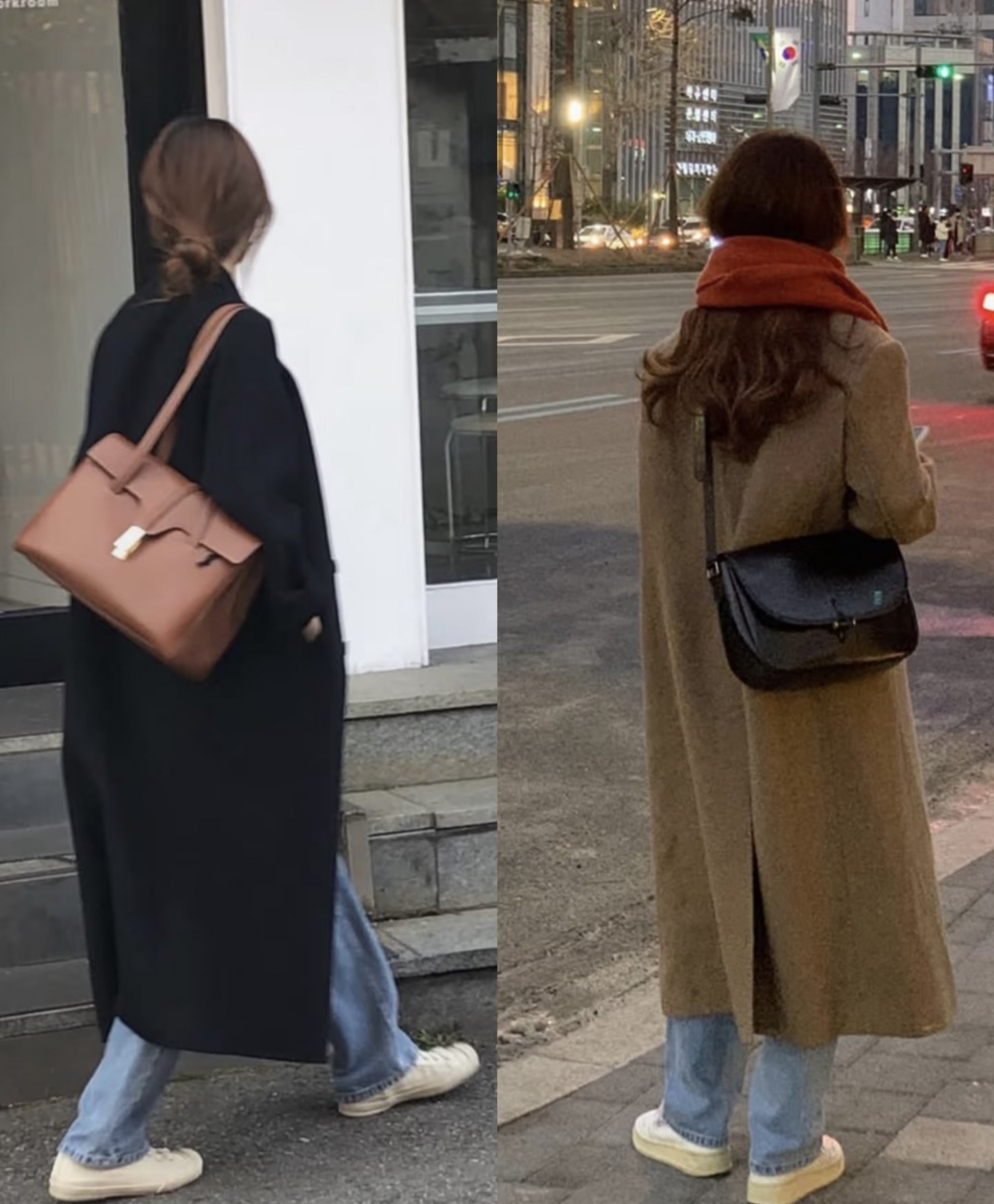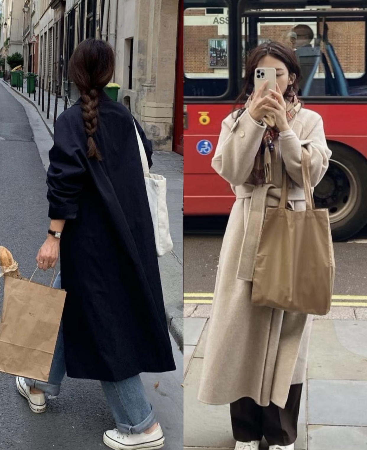 另外在版型上,韩国女生也更加钟爱宽松的设计,尽量避开过于修身的版型,会增加成熟感,而且活动起来也不方便。街拍中,以正肩直筒的H型大衣最为常见,直上直下利落显瘦,因为形成了纵向的长方形线条,即使长一些也不会拖累身高。或者是小姐姐身上的A字大衣,插肩袖的设计更慵懒,下摆加宽增加了包容性和松弛感。小个子可以挑选系腰带的设计,这样就不用担心hold不住啦!