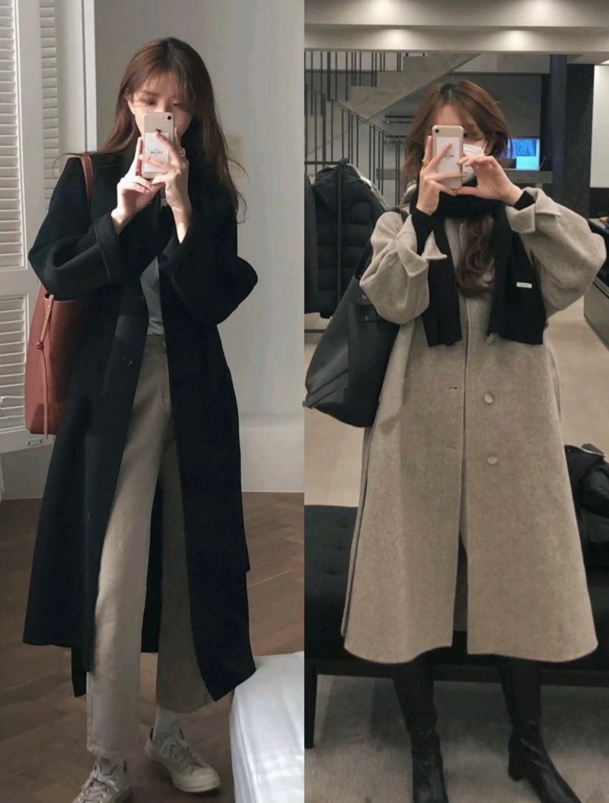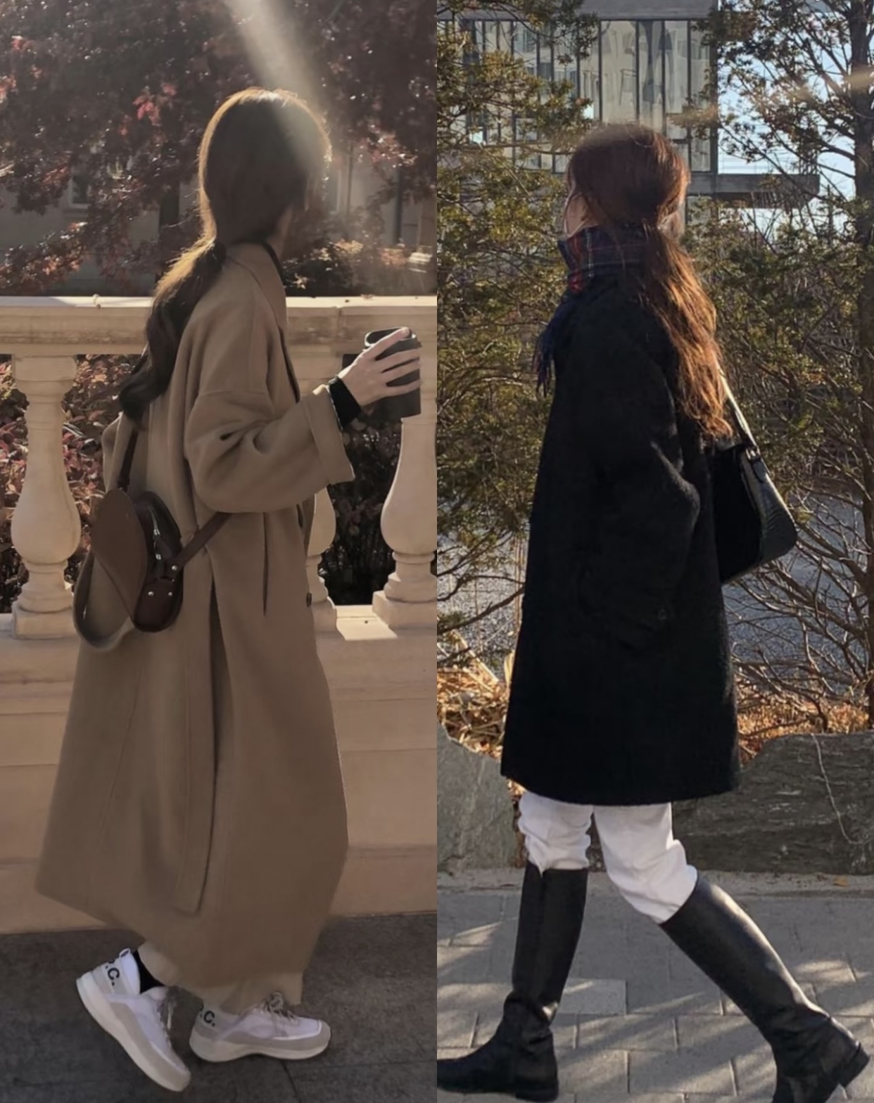 大衣的面料款式和它的长度不同,那么上身效果也会有很大的影响。在韩系街拍中,她们更钟爱一件能够过膝的长款大衣,上身更加的慵懒大气。而且冬季穿衣偏厚重,对于下半身本来就偏胖的女生来说,穿不好是非常容易显壮实的,那么一件过膝的长大衣就能够轻松遮住这些短板,看上去利落又显瘦。