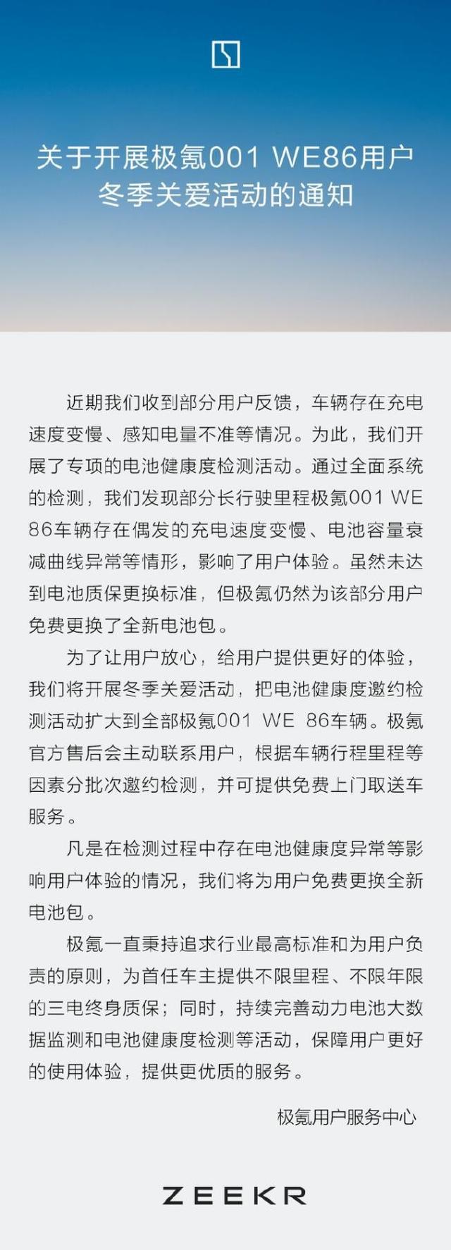具体来看看极氪的“冬季关爱行动”,这主要是针对极氪001 WE86车型的车主,提供免费电池健康度检测服务。一旦检测结果显示电池健康度不达标,极氪将无条件为车主更换全新电池,为车主们提供了安心用车保障。此外,对于部分未达质保标准的车型,极氪同样承诺提供免费换电服务,并将电池健康度检测纳入常规服务范畴,可见极氪此番的诚意有多大。