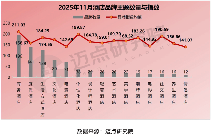1、据迈点研究院统计,11月各类型酒店品牌市场呈现“高端崛起、大众回调”的显著分化态势。高端及国际型品牌表现亮眼,成为市场核心增长引擎。大众消费型品牌则面临阶段性压力。这一趋势与行业“从规模扩张转向价值深耕”的变革方向高度契合,国际品牌凭借成熟的运营体系与品牌溢价能力,在淡季中展现出更强的价格韧性。