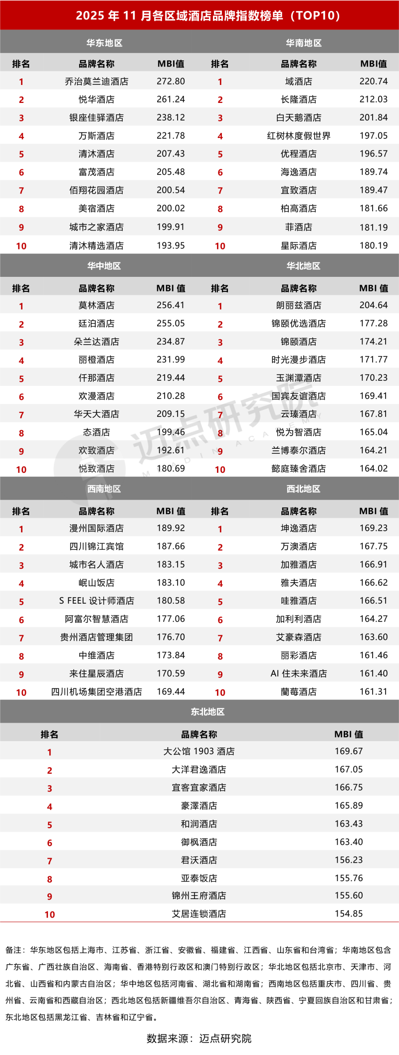 11月酒店品牌区域分化特征明显,品牌指数环比表现中,仅华北地区实现正向增长(+0.19%),其余六大区域均出现不同程度的环比下滑,其中西北地区降幅最为显著(-0.85%),东北地区降幅次之(-0.78%);华南地区环比下降0.31%,华东地区环比微降0.11%,华中与西南地区环比降幅一致(均为-0.09%)。整体而言,酒店区域品牌指数虽多数回调,但是整体回调幅度相对温和,区域市场格局未发生明显变化。