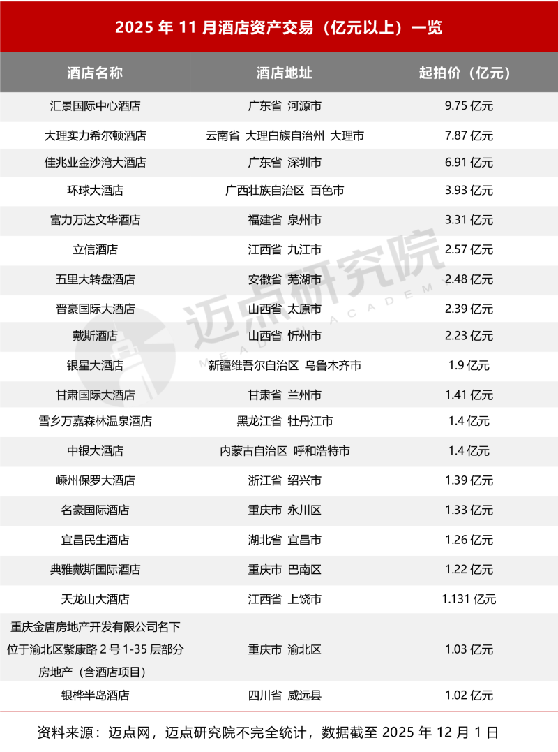 据迈点研究院不完全统计,2025年11月,共有80家酒店拍卖,其中拍卖价格在亿元以上酒店20家,拍卖价格在5000万元-1亿元酒店18家,拍卖价格5000万元以下42家,统计周期内共有4家酒店项目成交。