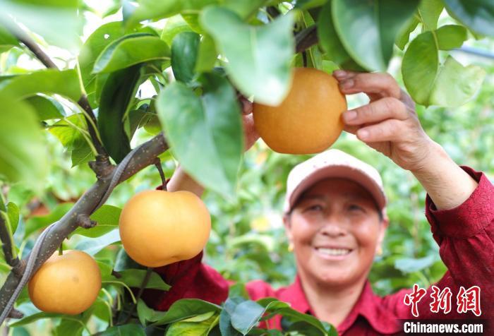 资料图:果农从树上采摘秋月梨。张进刚 摄