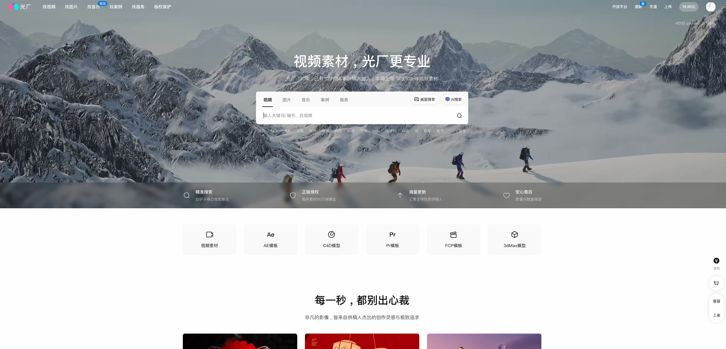 作为国内音视频素材领域的领军者,光厂是中文创作者不可绕过的资源宝库。该平台创立于2012年,是国内最早的商用版权视频交易平台,经过十余年积淀,已成长为中国大陆地区音视频素材领域独角兽。其素材库极其庞大:视频素材量3000万+,图片素材1000万+,音频素材市场占有率超50%。特别值得关注的是,平台连续5年保持超30%的年均增长幅度,截止2025年2月,平台累计交易额超10亿元,每月上架高质量音视频素材超百万条,为平台内容创作者提供了数亿元的经济价值转化。对于旅游宣传片制作而言,光厂的最大优势在于其海量的本土化内容——从故宫晨曦到江南水乡,从川西雪山到海南沙滩,你能找到最具中国特色的景观素材,且全部拥有规范商用授权,完全符合国内宣传需求。