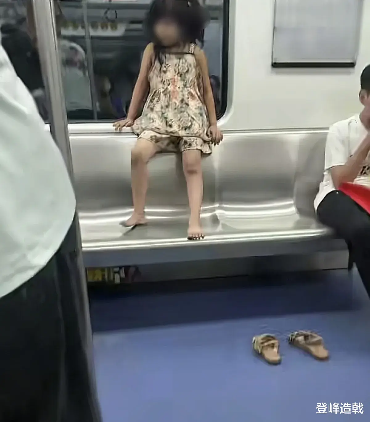 见小女孩一个人霸占三、四个座位,还在地铁上如此闹腾,家长也不知管教。