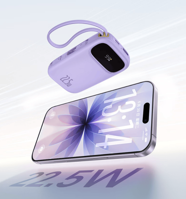 倍思Q电充电宝,电池容量20000mAh,额定容量11500mAh,能够提供充足的电量支持,无论是长途旅行还是日常外出,完全不需要担心电量不够用。它的主流功率为22.5W,虽然不如一些高端快充充电宝那样极端快速,但对于日常手机、平板等设备的充电需求,完全够用。可以通过它为多个设备充电,机身自带的数据线设计,十分便捷,省去了携带额外线缆的麻烦。