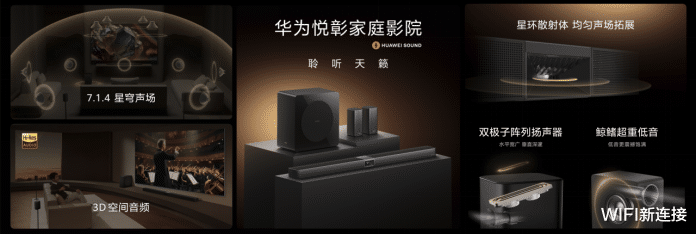 作为华为推出的首款高端组合音箱,华为悦彰家庭影院秉持极简设计,多声道音箱超薄机身搭配精致的环绕音箱与重低音音箱,完美融入现代家居环境。鎏金星光网布材质加持下,灯光映照浮现星光点点,自然融入现代家居美学环境。其搭载的7.1.4星穹声场,通过分布式音箱声道及声音解决方案,打造如天穹般环绕四周的三维宽阔声场,声音环绕身边,体验更加沉浸;鲸鳍重低音箱,采用独特鲸鳍形状设计,减少气流噪声,同时低音下潜可达22Hz,低音效果震撼来袭;3D空间音频算法,实时渲染环绕声及天空音,还原声音位置,让每次聆听都仿若亲临现场。加之Hi-Res认证及多种音效模式,满足观影、游戏、K歌等不同影音娱乐需求,搭配华为智慧屏使用,声效体验更佳。