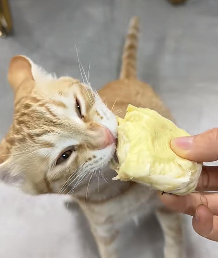 一位女士开心分享着她和宠物猫咪的榴莲时光:“打开榴莲后,它竟然舔着我的手,想要继续吃!