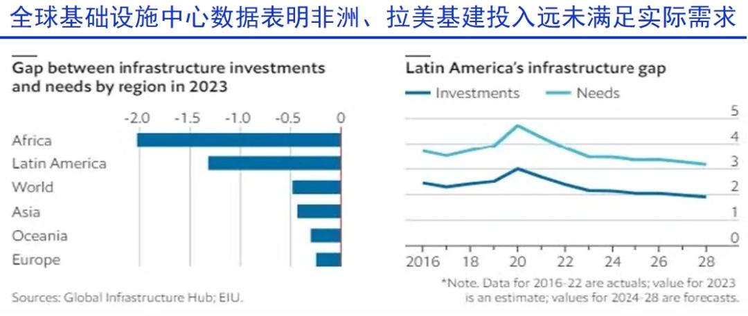 但就像讲述中东地区优势时候提到的,仅有需求还不够,想做好基建就必须有真金白银投入。 非洲、拉美等地区虽然客观上有着对基建的大量需求,但由于财政收入有限,大量的资源所有者其实都是欧美资本,利益无法被当地社会共享,难以支撑这个庞大产业真正发展起来。