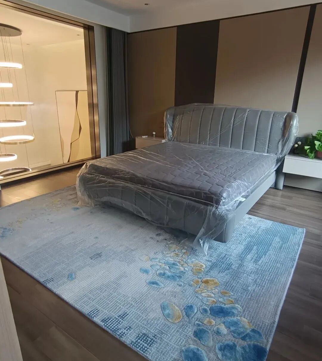 06 地毯铺满整个卧室地面邻居在床边上铺了一块很大的地毯,他说是为了光脚踩上去舒服。