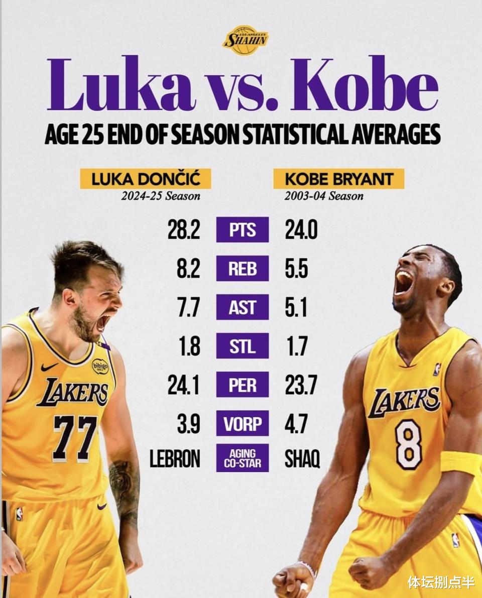 篮球世界总是热衷于跨时代超级球星的对话。2024-25赛季,25岁的卢卡·东契奇带着耀眼的数据与传奇巨星科比·布莱恩特在2003-04赛季的表现形成了耐人寻味的对比。以两人25岁赛季结束时的平均数据为基准,我们得以在赛场纯粹的表现中,感受两代核心后卫的异同。(数据截至北京时间2025年4月15日)