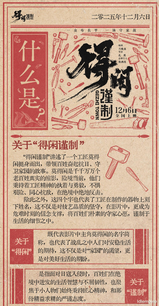 就像片名一样,得闲谨制,听着不解其意,跟抗日没什么关系,但你得拆开解构,得闲是主角名字、家园渴望,谨制是工匠精神、不屈韧性。