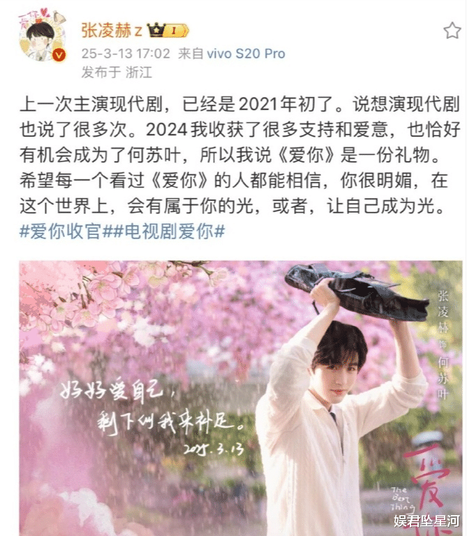张凌赫在接受采访时也说过:“春天适合看《爱你》,《爱你》是一部非常治愈非常温暖的戏,希望它可以让你有愉快的心情。”