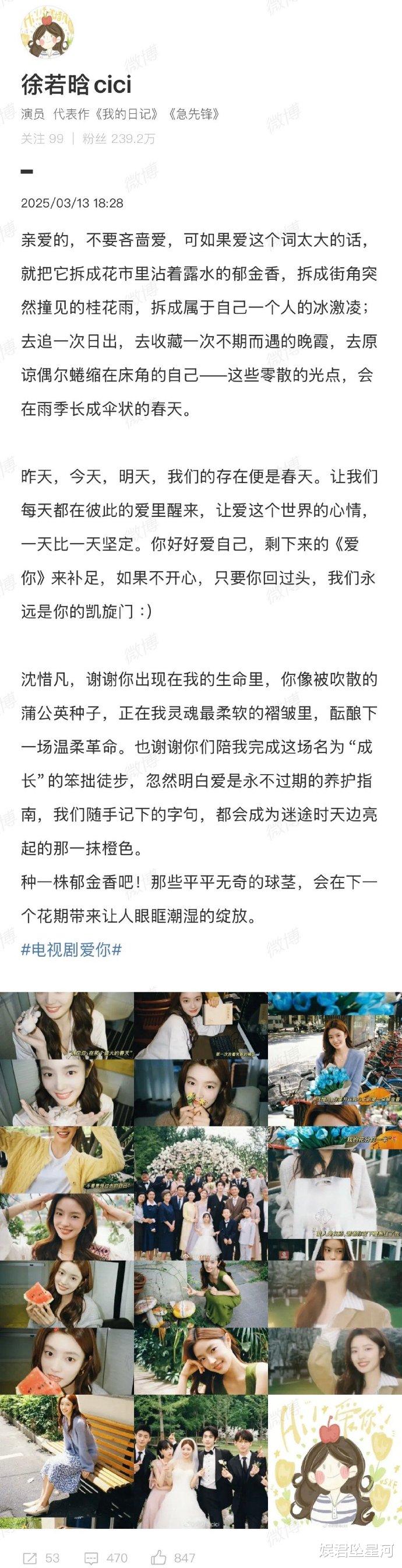 徐若晗发长文告别沈惜凡,还发了12宫格图片,非常养眼。文中写道不要吝啬爱,会共情沈惜凡的遭遇, 会肯定沈惜凡的付出。还一条一条给粉丝回信,特别真诚的徐若晗 ,沈惜凡请一直幸福 徐若晗也会被更多人知晓 ,真诚的人不会被辜负。