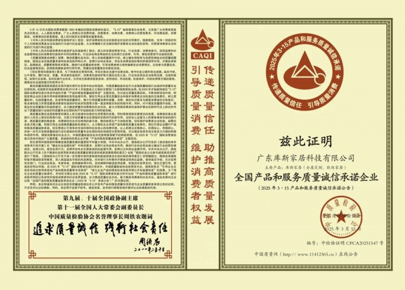 库斯家居倡导自然共生理念,在材料选择上采用可利用再生材料,严格遵循低碳工艺标准,通过优化生产流程、提高能源利用效率等措施,减少碳排放,实现绿色生产。值得一提的是,在刚过去的315消费者质量日中,库斯家居以绿色制造实力与过硬产品质量,荣获中国质量检验协会颁发的"全国质量诚信标杆企业"称号,为消费者树立品质信任典范。