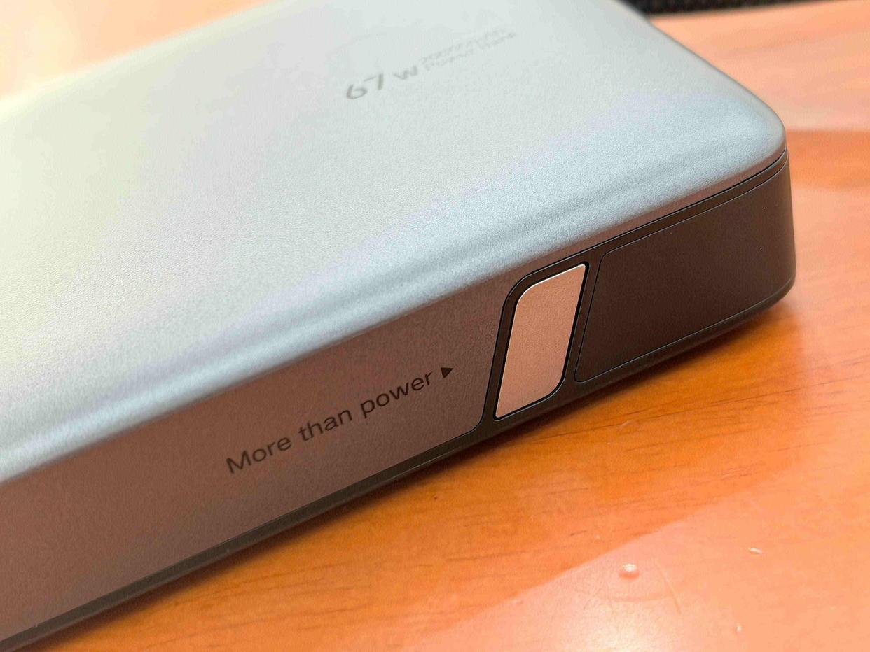 细节方面,我们可以看到绿联超能块67W充电宝采用了纯平嵌入式按键,电源键与机身严丝合缝,避免误触又提升整体感,非常高级。