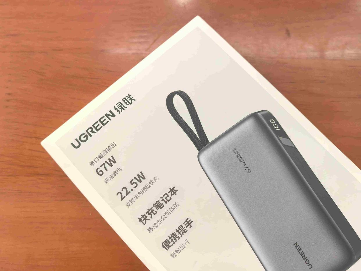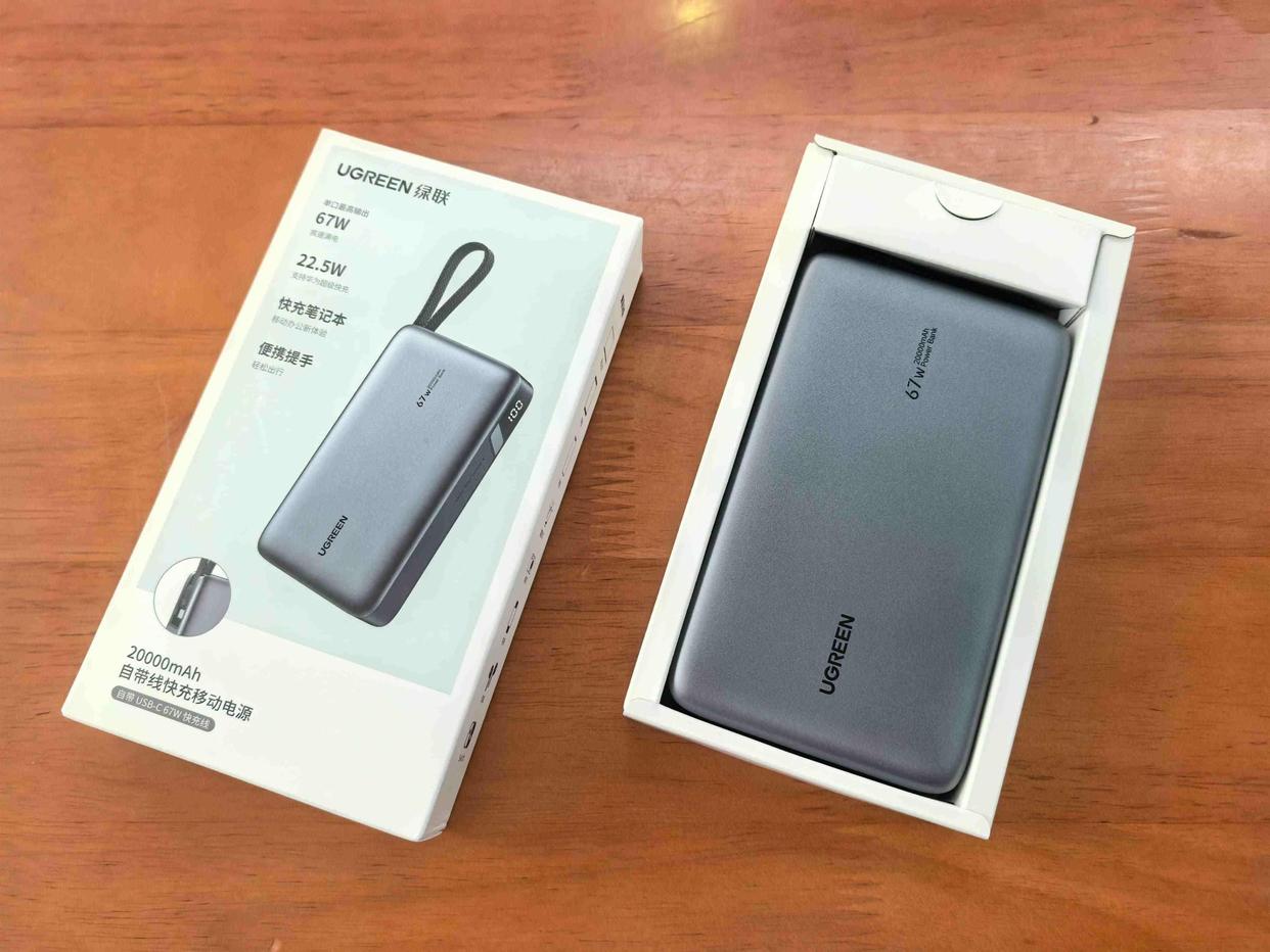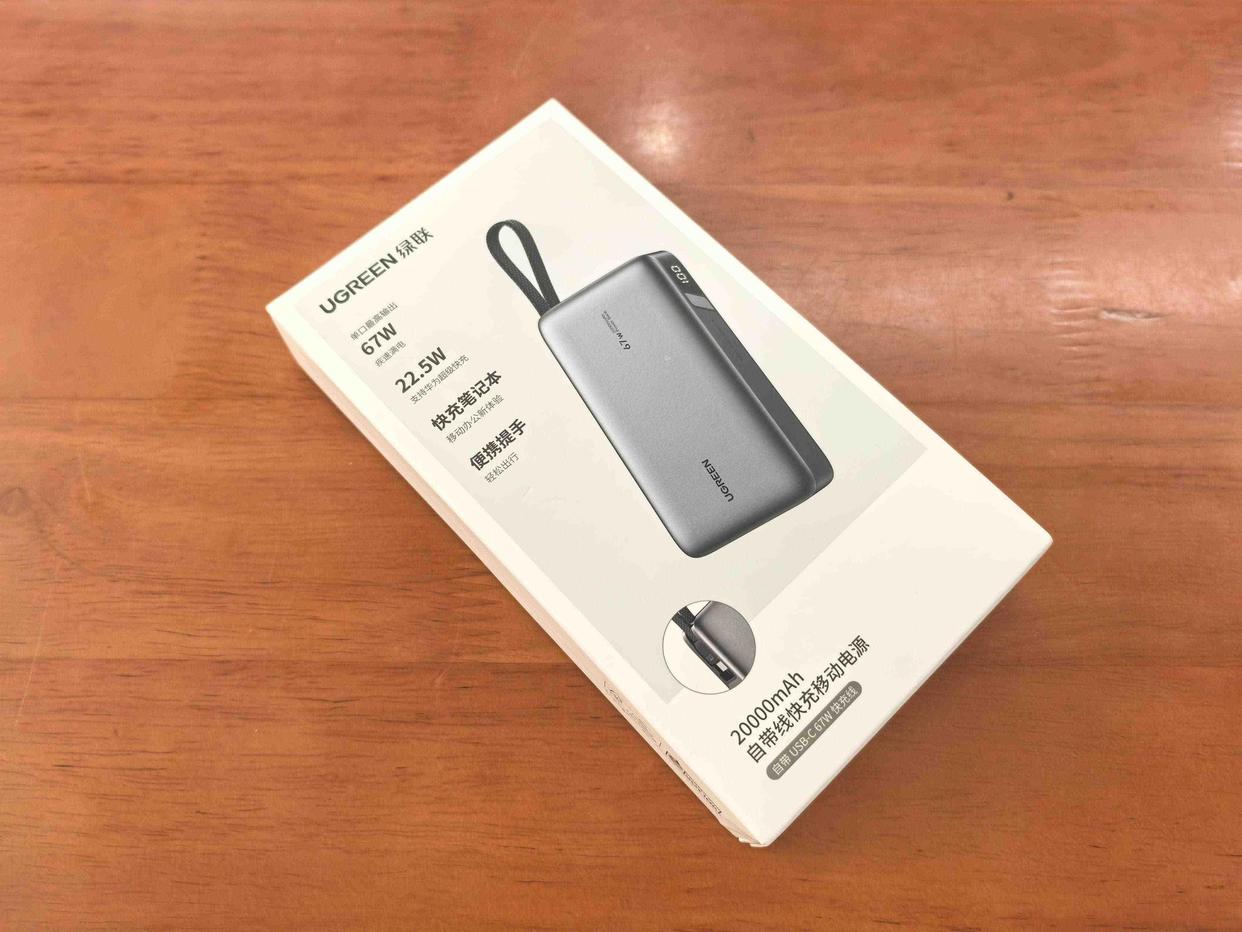 绿联超能块67W充电宝包装盒设计简约,正面是产品的实物图,让你在未开箱之前便对其外观一目了然。