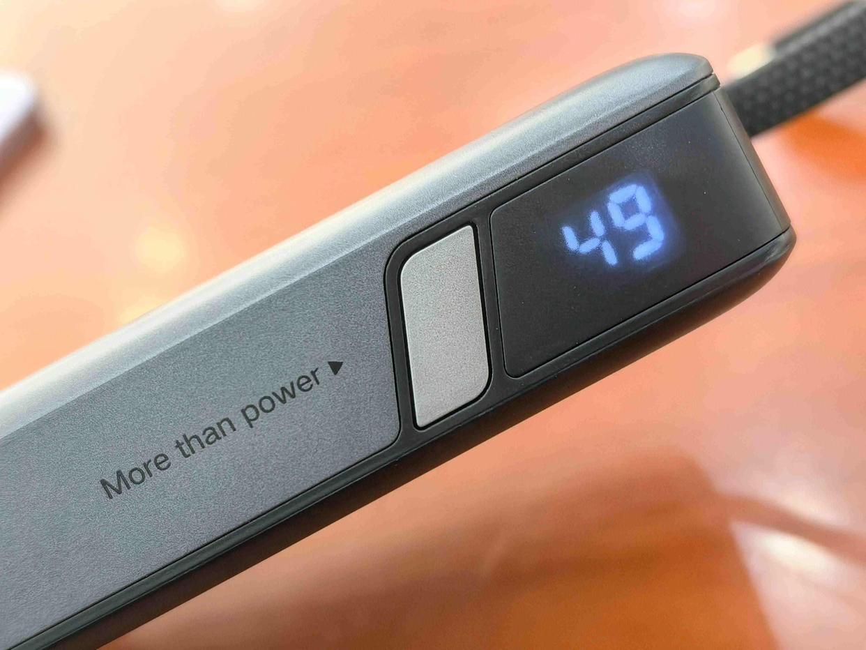 绿联超能块67W充电宝的设计亮点藏在细节中,隐藏式数显屏,未通电时完全隐形,按下电源键才亮起白色数字电量,视觉一体感极强。