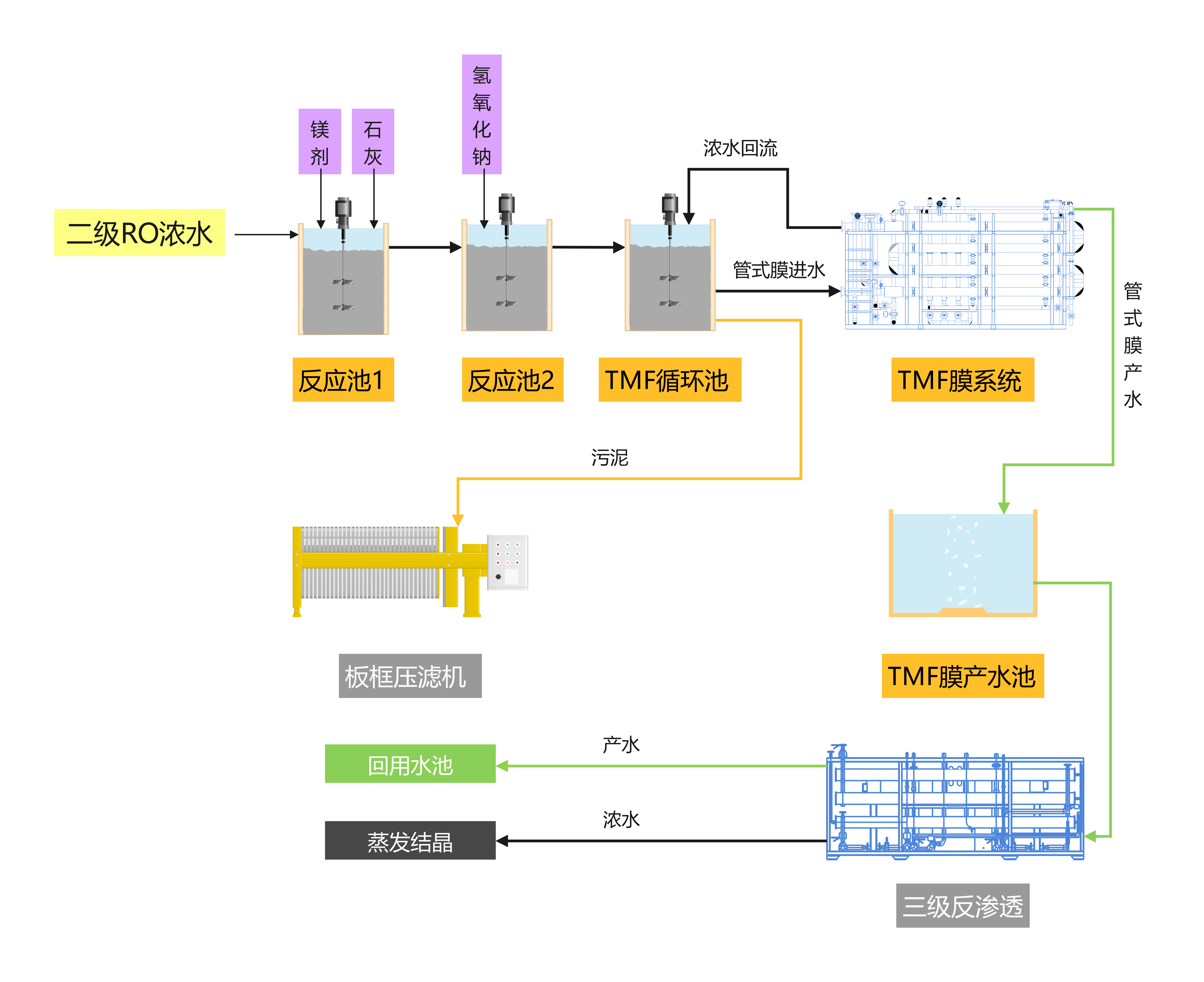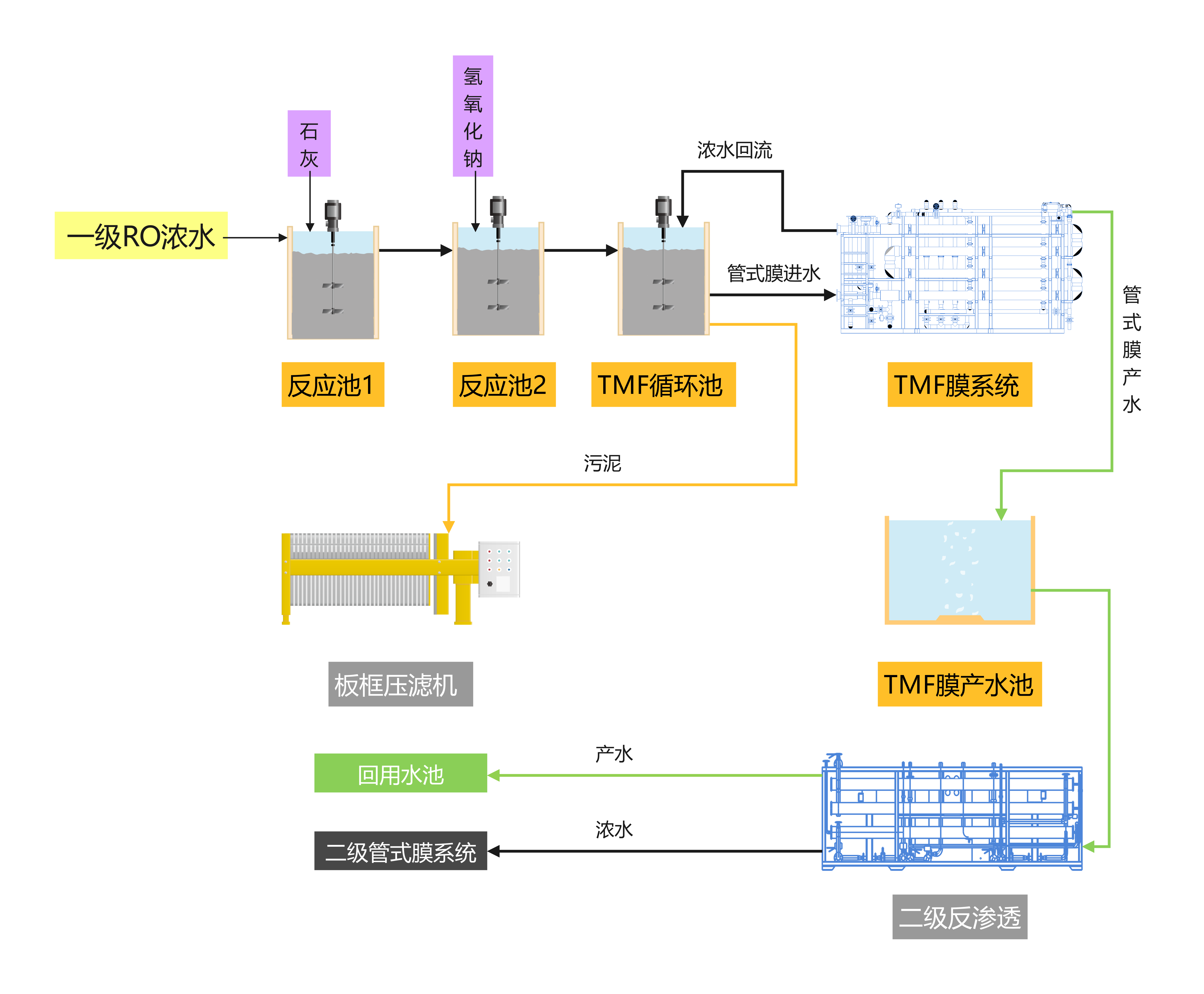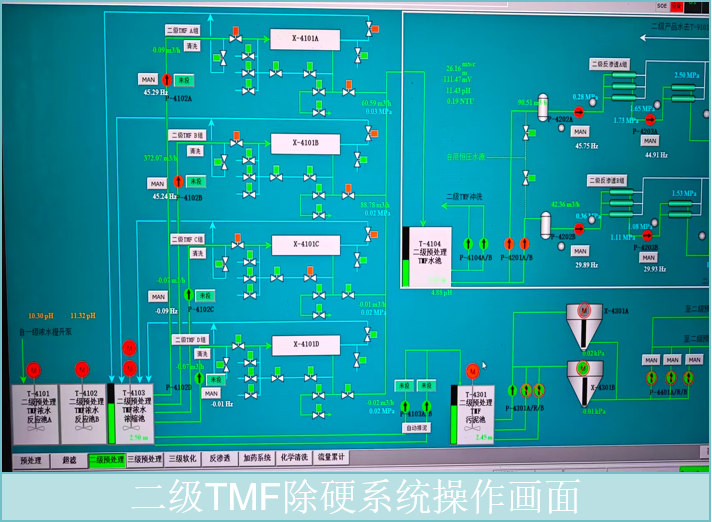 本项目碱度较高,管式膜除硬只需在进膜前投加石灰和氢氧化钠,待反应完全后,便可通过循环泵将其泵入管式膜进行固液分离。洁净的产水调节pH值后,即可送至二级RO作进一步浓缩。