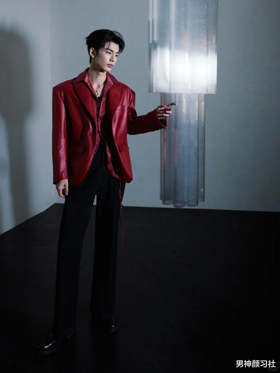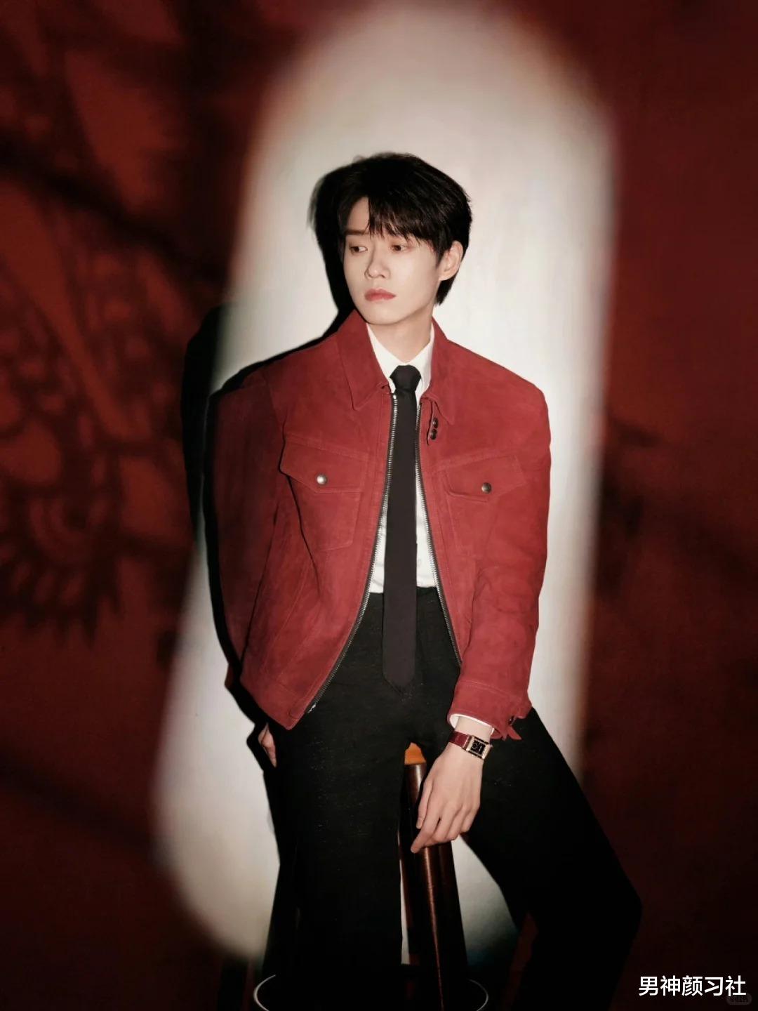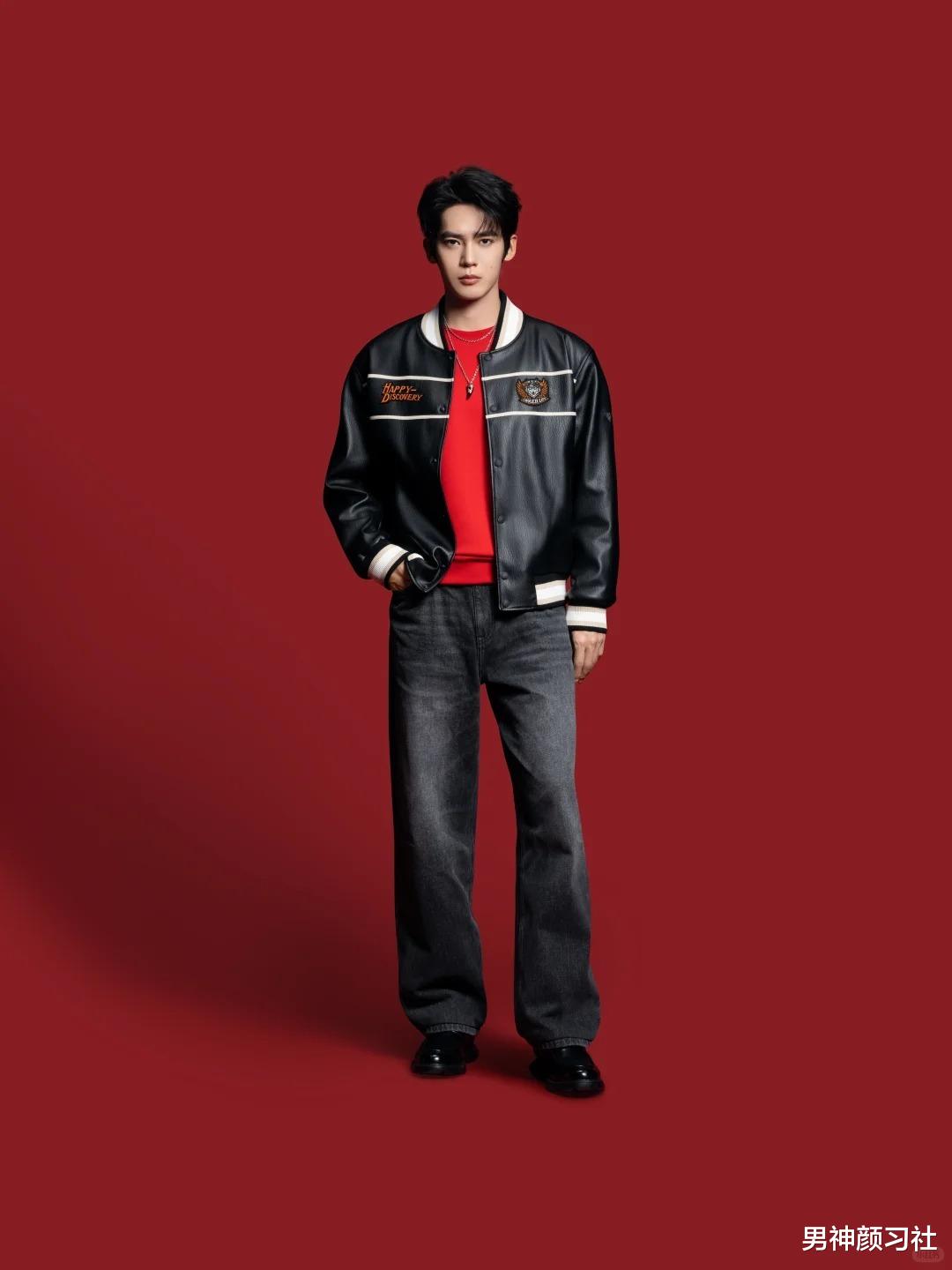 红色夹克/开衫 + 牛津衬衫 + 黑裤子这种穿法走的是休闲路线。红色在这里代表的是少年的活力。