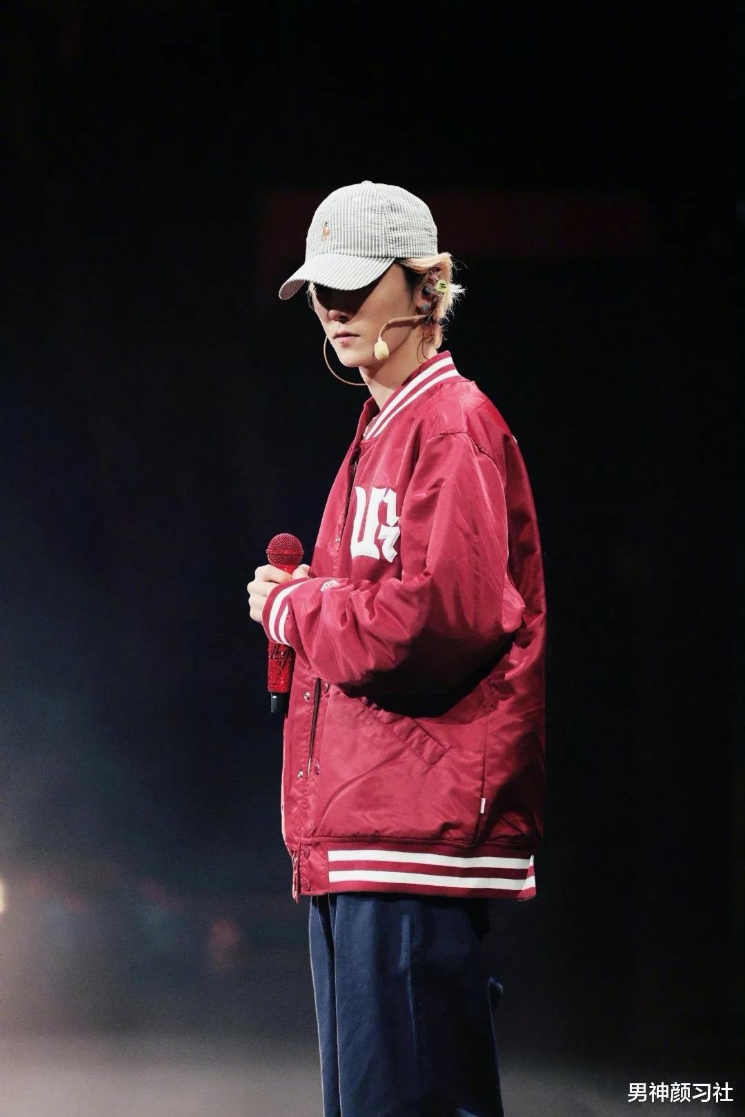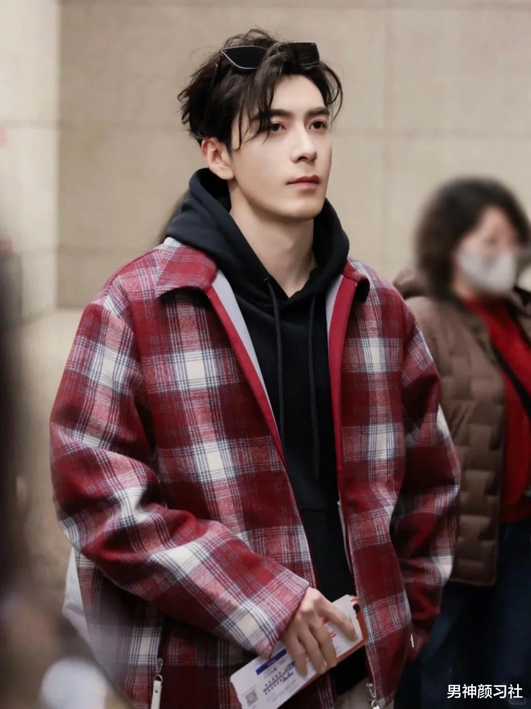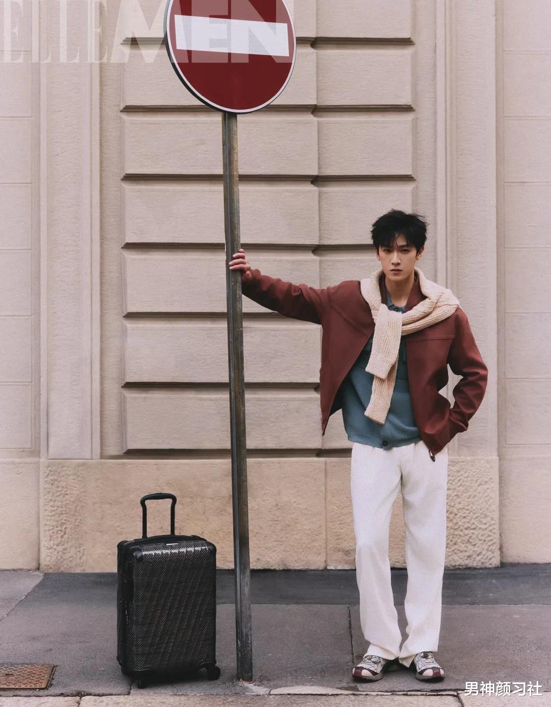 红色夹克/开衫 + 牛津衬衫 + 黑裤子这种穿法走的是休闲路线。红色在这里代表的是少年的活力。