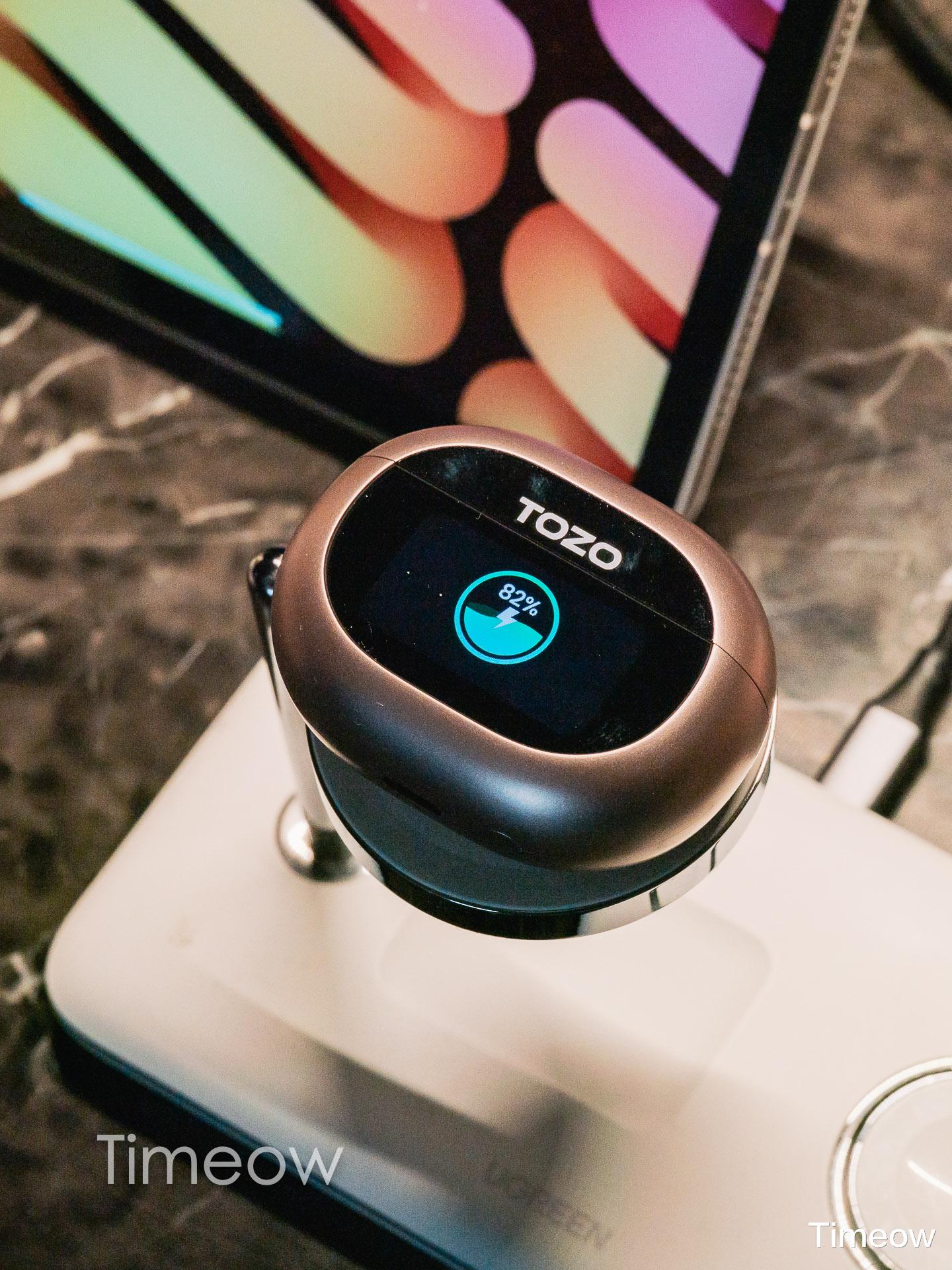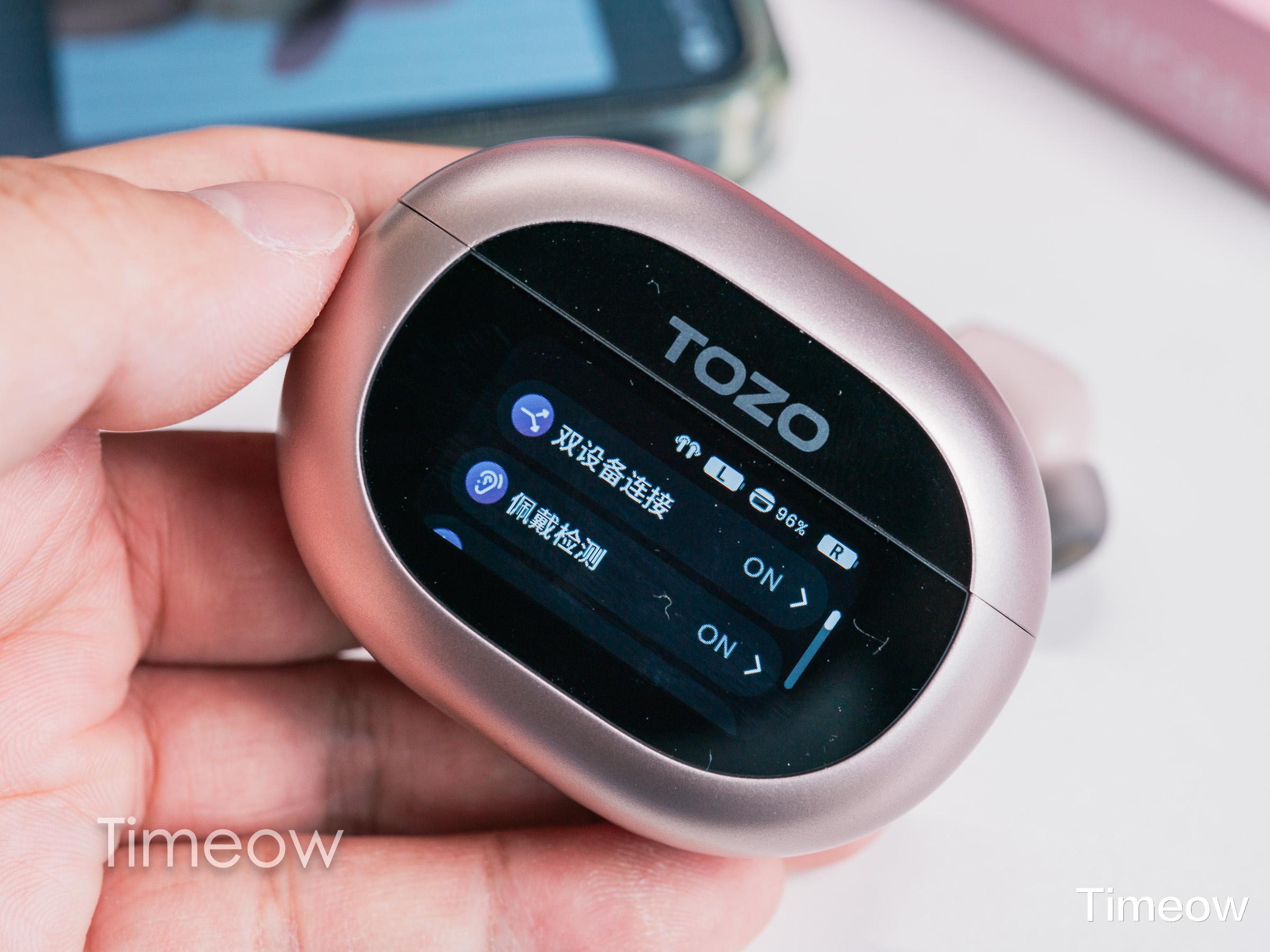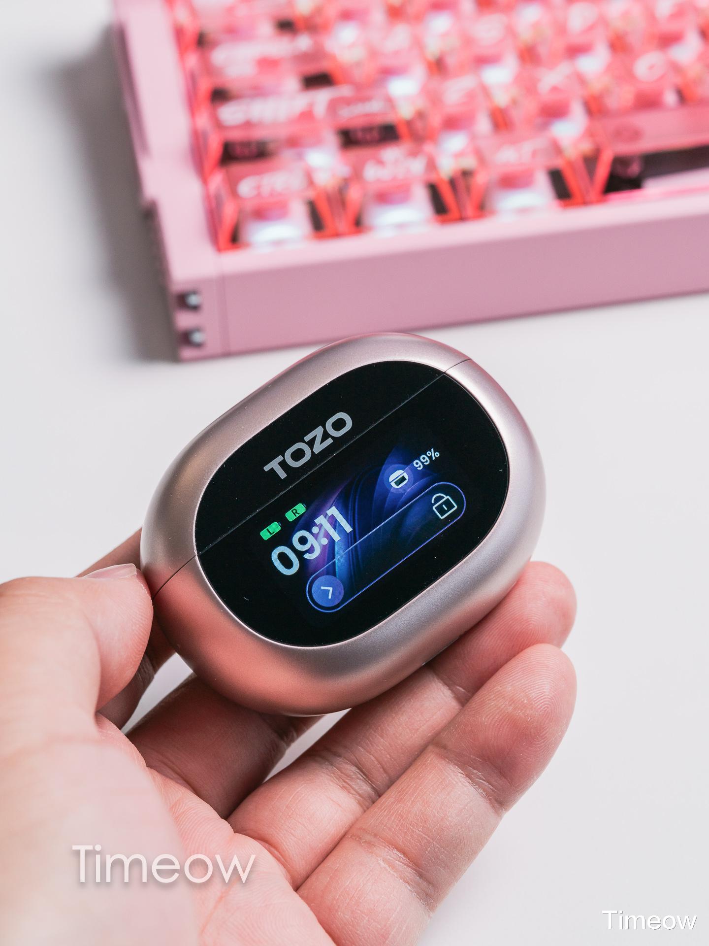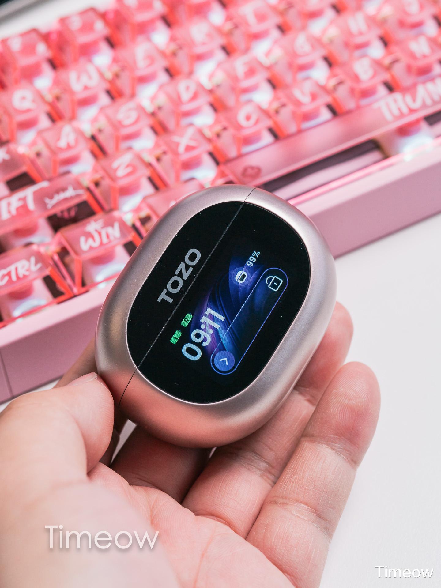 先看耳机盒设计,TOZO NC20 Pro 采用了鹅卵石般的椭圆造型,表面覆盖细腻的磨砂材质,触感温润且不易沾染指纹,握在掌心贴合度极高,日常放进口袋或背包完全不占地儿。更有意思的是,它的正面有一块LCD智能触控屏,无需拿出手机就能实现多种操作,稍后我会聊。
