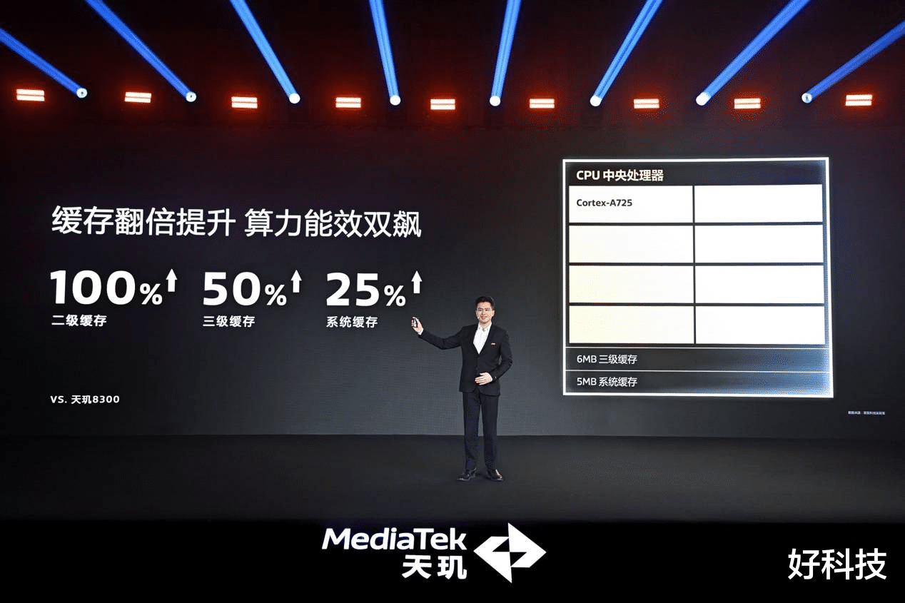 除了全大核设计,天玑8400还在架构层面进行了深度优化,包括大幅提升了缓存系统。二级缓存翻倍,三级缓存增加50%,这些改进有效提升了芯片的算力,使得多任务处理更加高效,充分释放了全大核架构的潜力。得益于这些硬件和架构上的改进,天玑8400的多核性能相比友商同级竞品提升高达32%,而CPU峰值功耗却降低了44%。这种“性能猛增、功耗猛降”的表现,充分展现了天玑8400在能效方面的卓越表现。