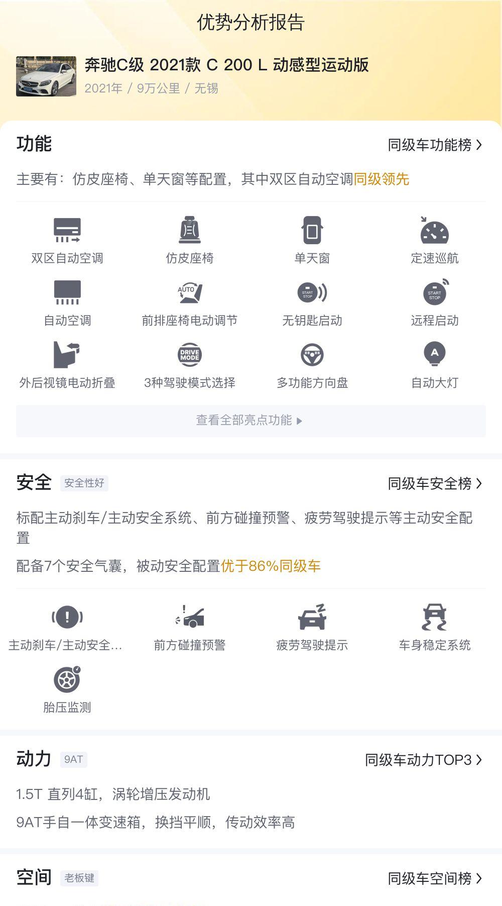 除了价格和车况,性价比也是一个重要的考量因素。性价比并非单纯指价格便宜,而是指在同等价格下,这辆车的配置、性能、品牌价值等方面是否具有优势。2021款奔驰C级动感型运动版,作为一款豪华中级车,在品牌价值、驾驶体验、舒适性配置等方面具有一定的优势。例如,它配备了仿皮座椅、单天窗、双区自动空调等舒适性配置,以及主动刹车/主动安全系统、前方碰撞预警、疲劳驾驶提示、7个安全气囊等安全配置。这些配置在同价位的其他品牌车型中并不常见。