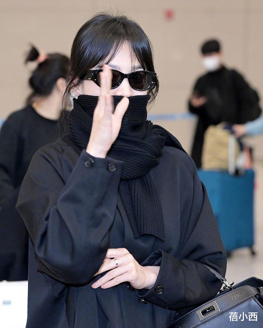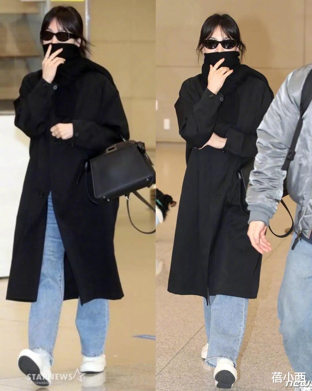 不知道大家有没有发现,宋慧乔在穿大衣的时候很喜欢把围巾颜色和大衣颜色选的相同,一整套造型会更加的协调,同时也会更容易驾驭。宋慧乔身上的这件黑色大衣是一个比较宽松的版型,整体的面料也会更有光泽度,不像其他黑色大衣一样,看起来死气沉沉的还容易粘毛毛,这种亮面的大衣看起来会更有女王范。