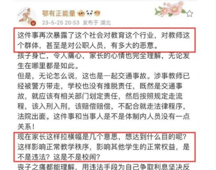 “鄂有正能量”在微博拥有125万粉丝,算是名副其实的百万大V,但是名字叫“正能量”,发表的言论却句句扎心,在男孩碾压身亡后,发表了一系列惨无人道的看法,目前已被平台永久封禁。