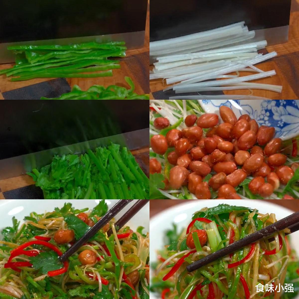 3、再放蒜末、葱段、干辣椒,泼上热油激发出香味调味,加白糖、一勺生抽、半勺陈醋和少许蚝油,最后放入花生米、一把香菜,翻拌均匀就可以开吃了。