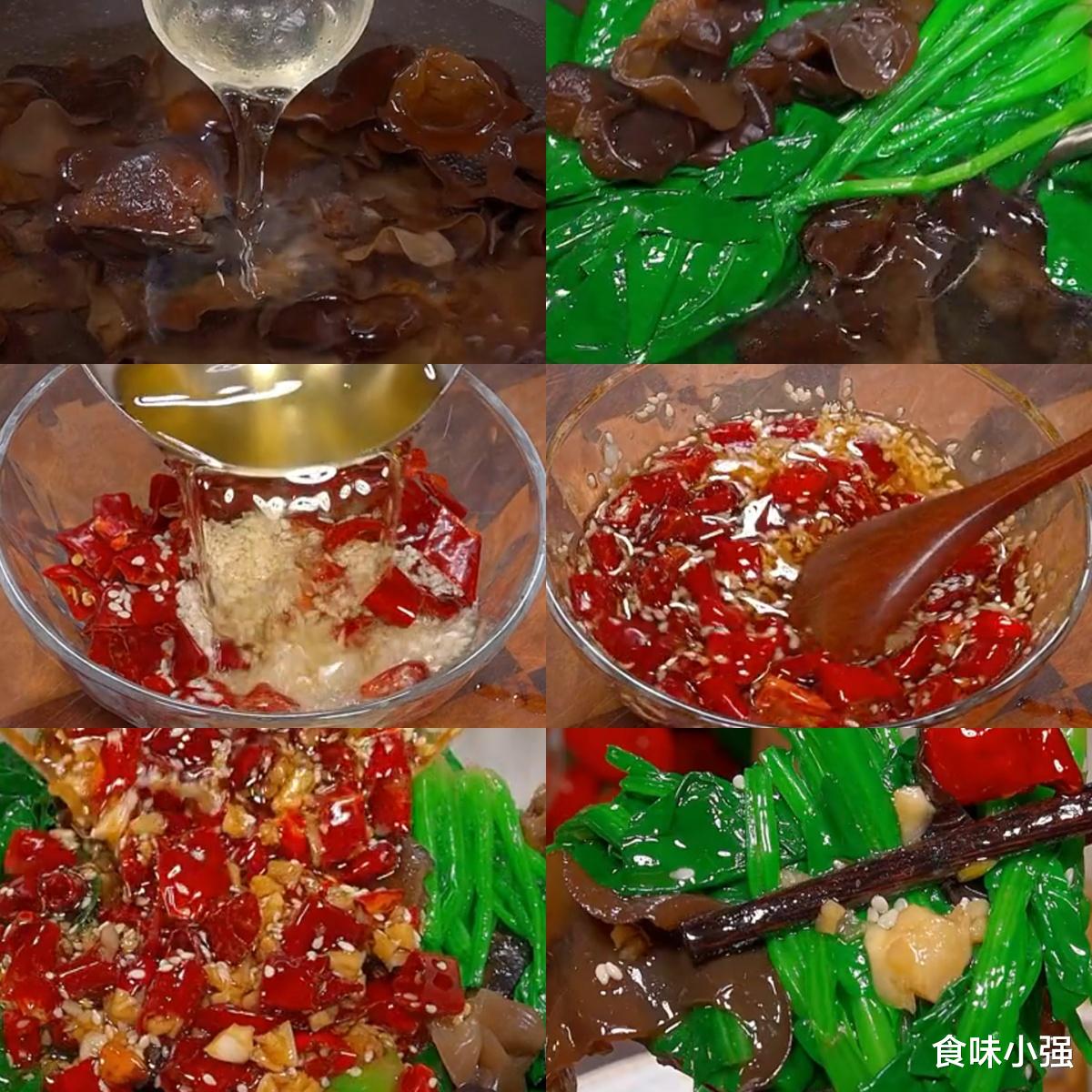 1、首先水开下泡好的木耳,加少许食用油,再放入菠菜,酌烫30秒左右,捞出过凉,放入盘中。