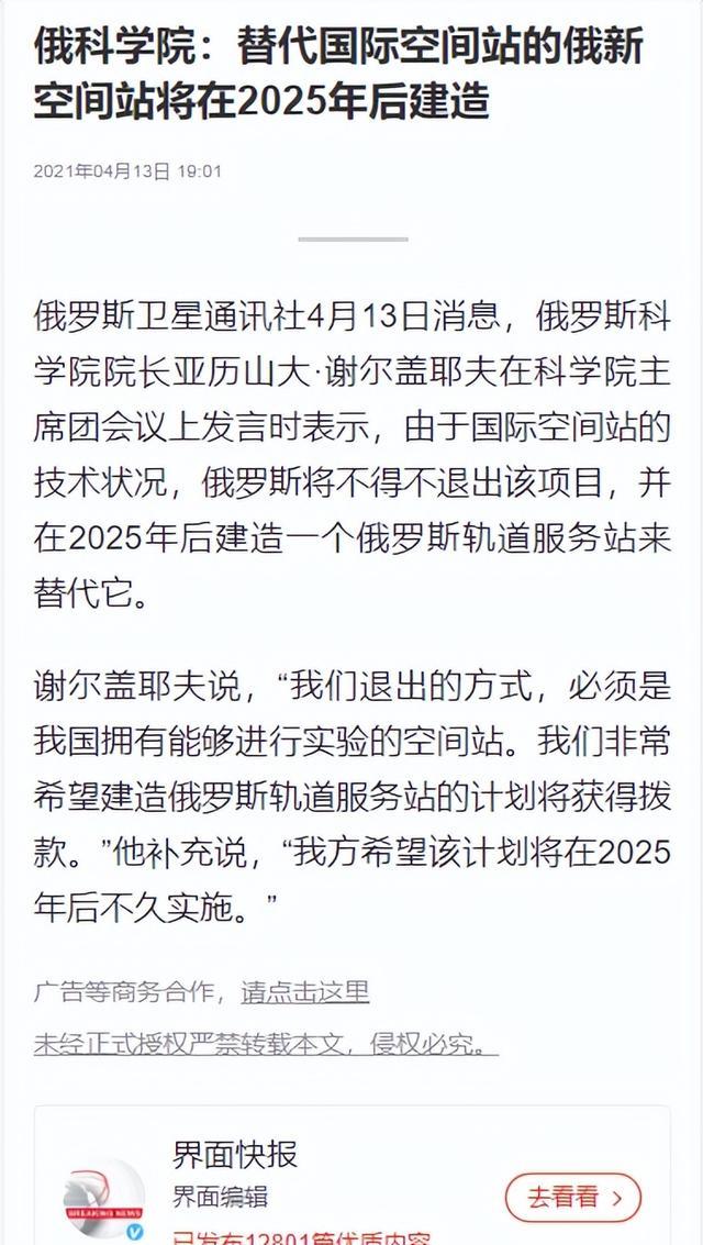 界面快报——俄科学院:替代国际空间站的俄新空间站将在2025年后建造