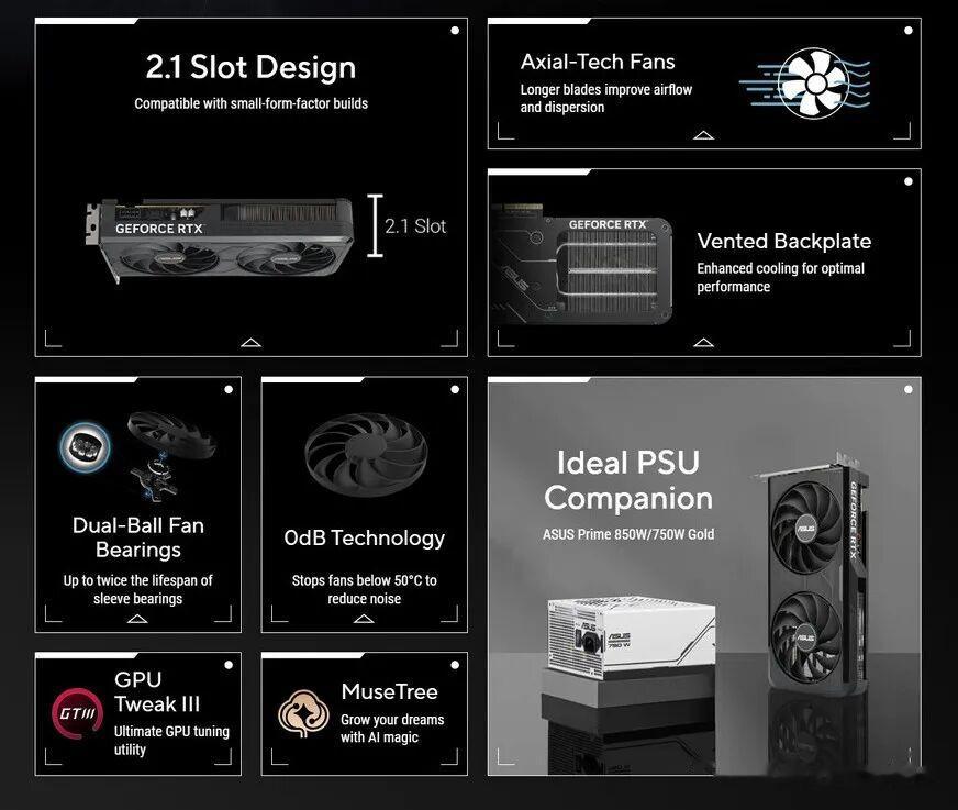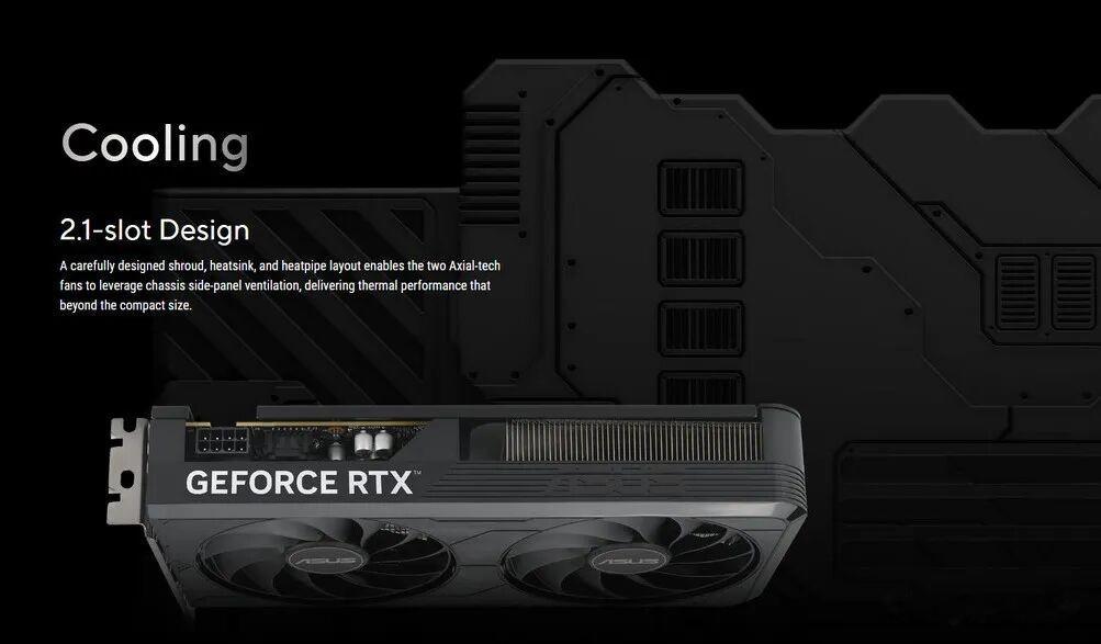 EVO版依旧采用双风扇设计,但散热片结构大不一样。虽然仍配备Axial-tech风扇和铝制鳍片内的热管,但热管不再像非EVO版那样从侧面外露。新款的鳍片改为垂直排列,整体更紧凑,厚度也从2.5槽缩减至2.1槽。令人略感混乱的是,这一代的EVO外观其实早在2025年中就随“纯”DUAL GeForce RTX 5050系列首发,彼时为真正的2.0槽。