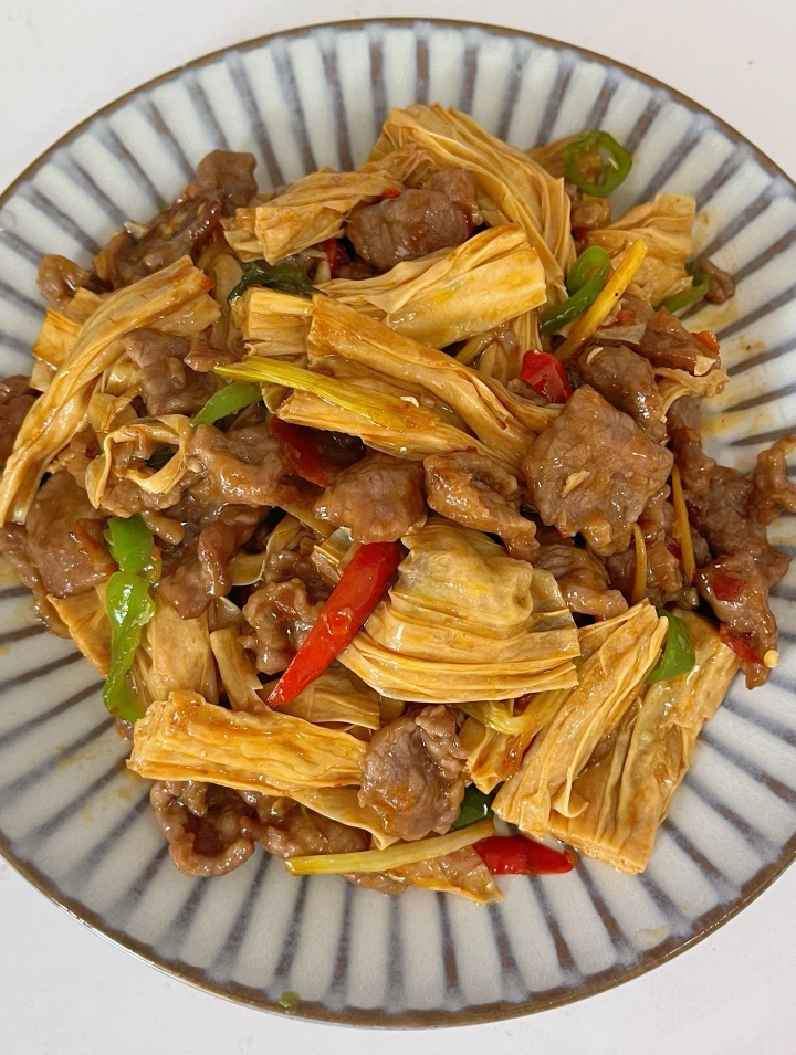 出锅的牛肉炒腐竹,色泽油亮诱人,红的辣椒,绿的蒜苗,黄的腐竹,褐的牛肉,交织在一起,光是看着就让人食指大动。夹起一筷子,腐竹的豆香与酱香完美融合,口感软糯又带着一丝嚼劲,牛肉则滑嫩入味,咸鲜中带着一丝微辣,层次丰富,回味无穷。它不是一道需要细细品味的菜,而是一道让人忍不住大快朵颐的下饭神器。无论是忙碌工作日的晚餐,还是家人闲聚的周末,一盘热气腾腾的牛肉炒腐竹,总能用最直接的美味,抚慰每一个饥肠辘辘的胃,温暖每一颗向往家的心。好吃到舔锅底,不是夸张,而是对这口家常美味最真挚的赞美。今晚,就让这道喷香的牛肉炒腐竹,成为你餐桌上的主角吧。