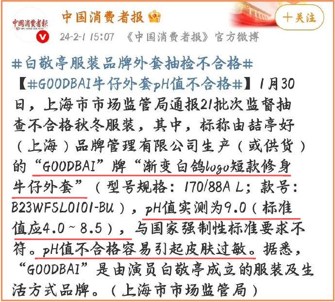 白敬亭一款渐变白鸽LOGO牛仔外套的pH值实测为9.0,超出标准4.0-8.5的范围。
