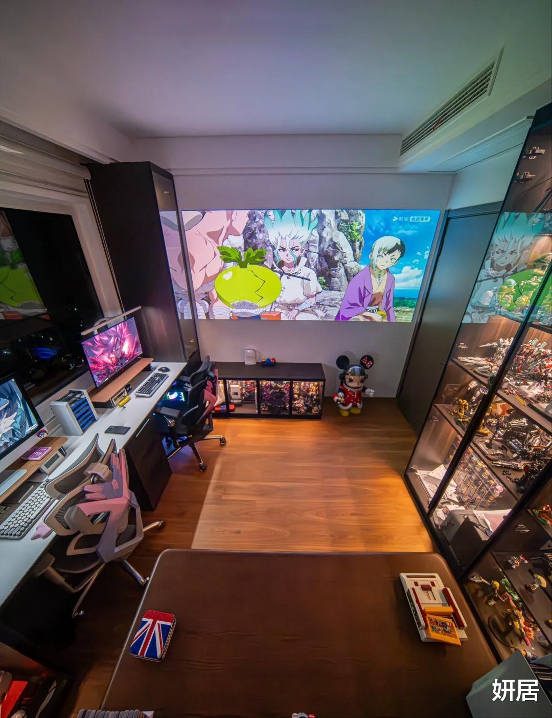 网友@半杯豆浆是一名电竞爱好者,装修时也做了一件“妈见妈打”的设计,那就是把客卧做成自己的快乐屋。在传统定义里,家里的第三间房通常都被用来做客房。好在他和他老婆臭味相投,喜欢打游戏、动漫,坚持把卧室做成了电竞房,观影区,手办收纳区,双人电脑位应有尽有。