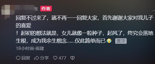 男孩爸爸表示,没想到给女儿取了个名字,竟然搞得“父子关系决裂”。根据男孩父亲社交账号显示,他们给妹妹取的名字叫“李念”,是翻阅了很久的字典,觉得“女儿就像一粒种子,起风了,终究会落地生根,成为余生想念”。
