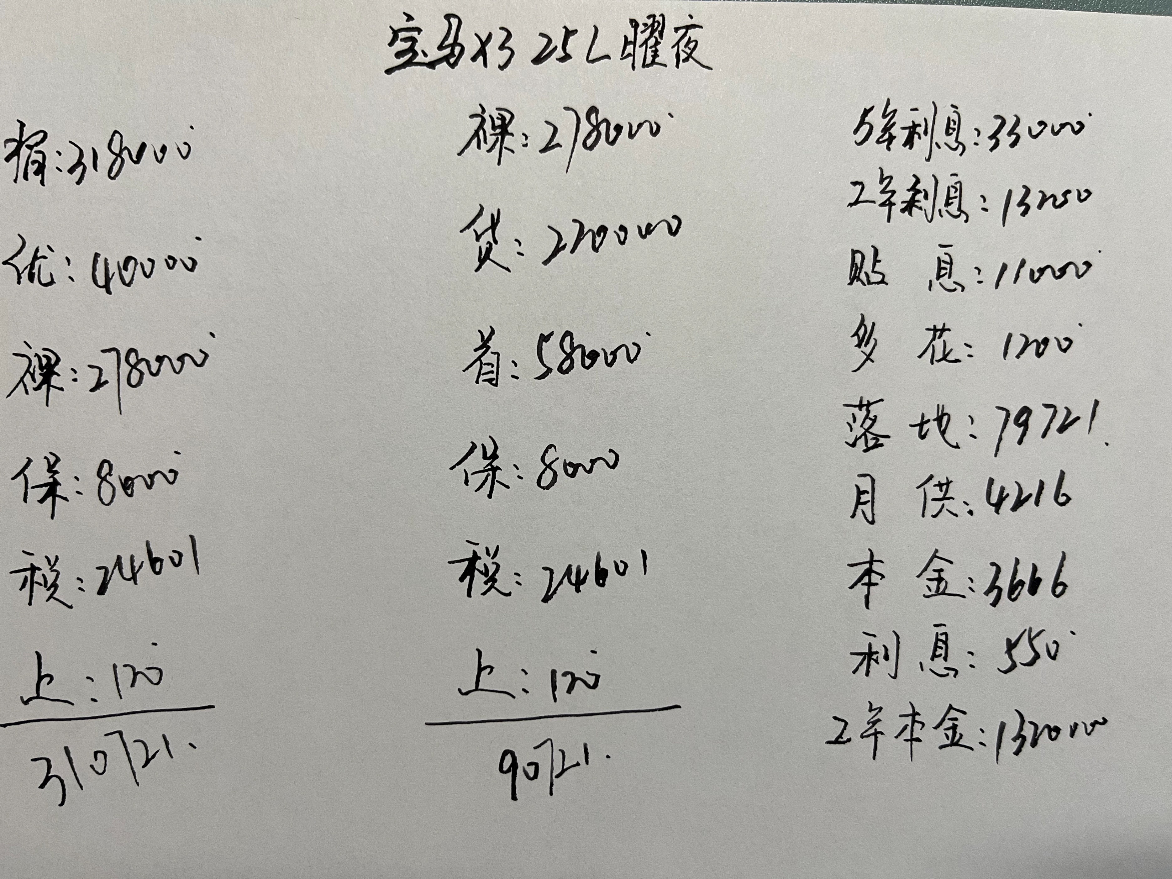 2026款宝马X3 25LM曜夜M运动套装厂商指导价318000元,目前我所了解的现金优惠40000元,车辆裸车价278000元,车辆保险大概8000元左右,车辆购置税24601元,自己上牌120元就可以,全款落地参考价310721元。
