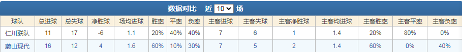 仁川联近期状态起伏不定,球队最近5轮联赛仅仅录得1胜2和2负,其中球队上一次经历和局之后的下一场都以失利告终,而上轮联赛,仁川联刚巧和局收场,加上此番对手是领头羊蔚山现代,仁川联很大机会将继续这一规律。值得一提的是,仁川联今季整体胜率不高,头8轮仅仅取得2场胜利,主客各一,尽管球队今季主场未尝败绩,但75%的平球率(头4轮3场平)已经足以说明他们今季联赛缺乏足够的争胜能力。再加上球队上一次韩职联主场击败蔚山现代已经是2018年9月的事,同时最近5次主场交手仁川联多达4场食白果,由此可见球队近年交手仁川联同样缺乏入球手段,这无疑需要全成勋和R.靴南迪斯等主力攻击手认真对待。