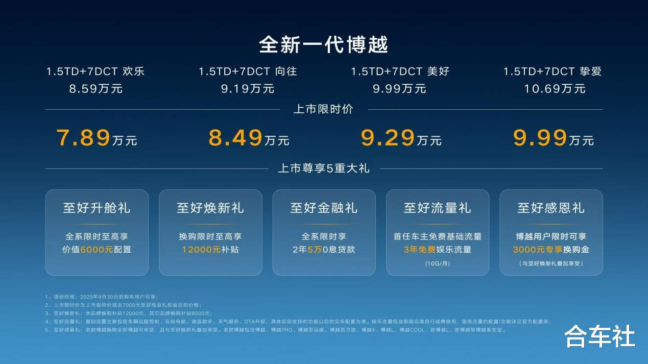 8 月 17 日,在宁夏银川览山音乐节上,吉利全新博越正式上市,共推出欢乐、向往、美好、挚爱四个版本,官方指导价格是8.59万-10.99万元,上市限时价为7.89 - 9.99万元。从市场角度看,这样的定价和福利政策,在 10 万内家用 SUV 区间具备一定竞争力,尤其对预算有限的家庭用户来说,降低了购车门槛。接下来,我们从实际使用角度解读这款车的核心亮点。