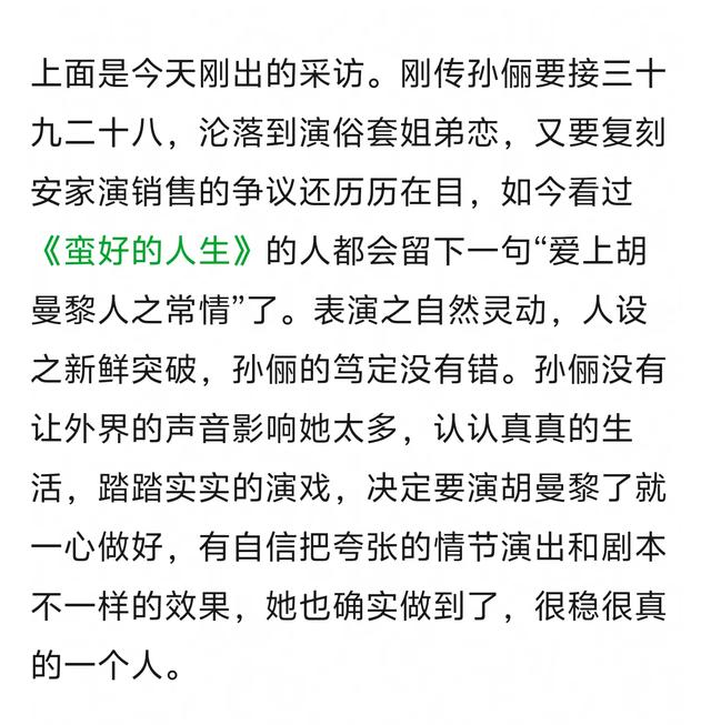 没人不爱胡曼黎。但是这个角色没有她的塑造,也一定会被骂的,她作为演员,已经是拥有顶级塑造和演绎能力了。虽然她每次接饼,大家都会有不一样的声音。但是只要剧一出来,大家都是相信娘娘的选本能力的。这就是作为演员的观众缘。她的剧听到过最多的一句话就是,孙俪的戏,高低要去看一眼。