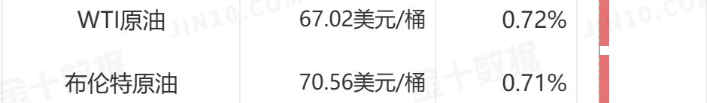 随着中东地区地缘政治风险再度回温,以及美国政府数据显示燃料库存减少,国际油价反弹。WTI原油在EIA数据公布后持续走高,最终收涨0.72%,报67.02美元/桶;布伦特原油收复70关口,收涨0.71%,报70.56美元/桶。