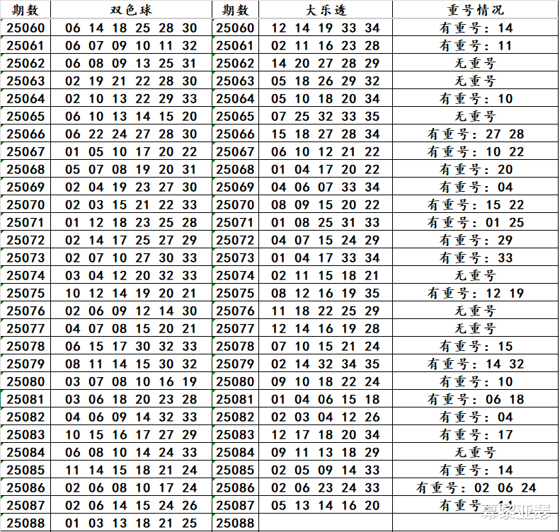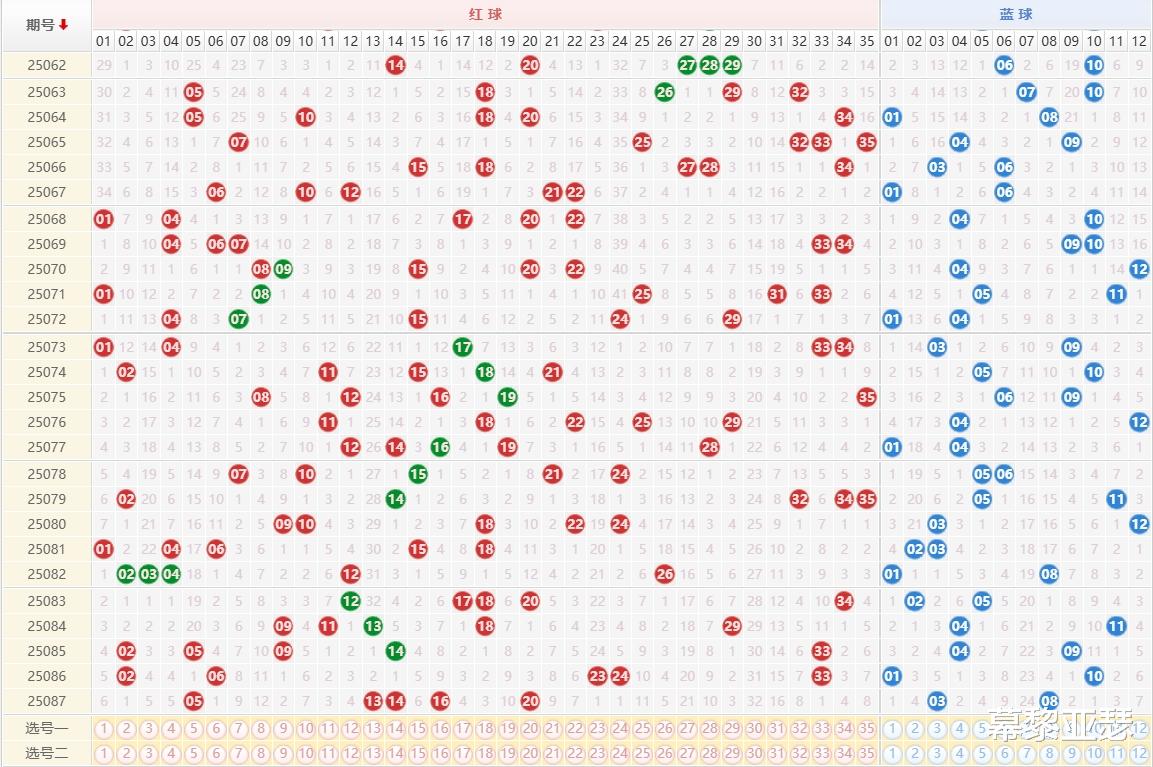 25087期大乐透自身出现了两个重号:13(周六)、20(历史),一般情况下本期自身重号的个数:1-2个,从目前走势指向情况看,本期存在重号的红球:13,另外基本走势图和周一走势图,存在两张图都是重号的红球:05、14,因此考虑其中放手一个,图形角度看,历史走势图,红球23也存在重号的可能,因此本期可能重号的红球:05、13、23