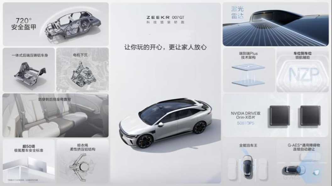 在车机配置上,极氪007GT还使用到32+125GB存储的ZEEKR OS车载智能系统和高通8295芯片,不仅支持上述娱乐应用的下载,还可以提供智能寻车助手、全场景3D车道级导航、无麦K歌、语音交互等等,智能化程度表现出色。而新车在智驾方面还配备有激光雷达、双Orin X(总算力为508TOPS)以及31颗智能感知硬件等等,支持极氪千里浩瀚智驾H7方案,能够轻松应对多种复杂路况以及停车难题,还配有40+主动安全技术,其中包含的G-AES通用障碍物自动连续避让功能,能够让车辆在智驾过程中主动避开路面上的障碍物,减少因视线不明导致的意外碰撞事故。