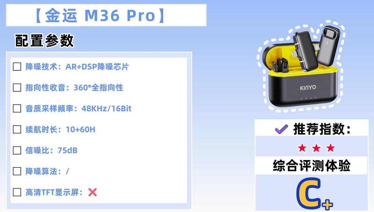 作为金运m36升级款,在音质与功能上全面优化,性价比突出。核心亮点在于音质升级与多功能:搭载高灵敏度咪头+AI降噪算法,能过滤室内杂音,人声清晰自然,支持混响与变声功能,直播互动趣味性拉满。48kHz/24Bit采样率保障音质出色,延迟控制在40ms内,日常拍摄无压力。传输采用蓝牙5.3技术,10米距离内连接稳定,适配手机、平板、电脑,支持无线伴奏。机身设计轻巧便携,手持佩戴两用,配备防风毛套,应对轻微风噪。续航方面,单次续航8小时,Type-C接口充电便捷。支持一键录音,录音文件直接保存,操作简单,新手快速上手。兼容主流直播平台,是进阶新手用户的优选。