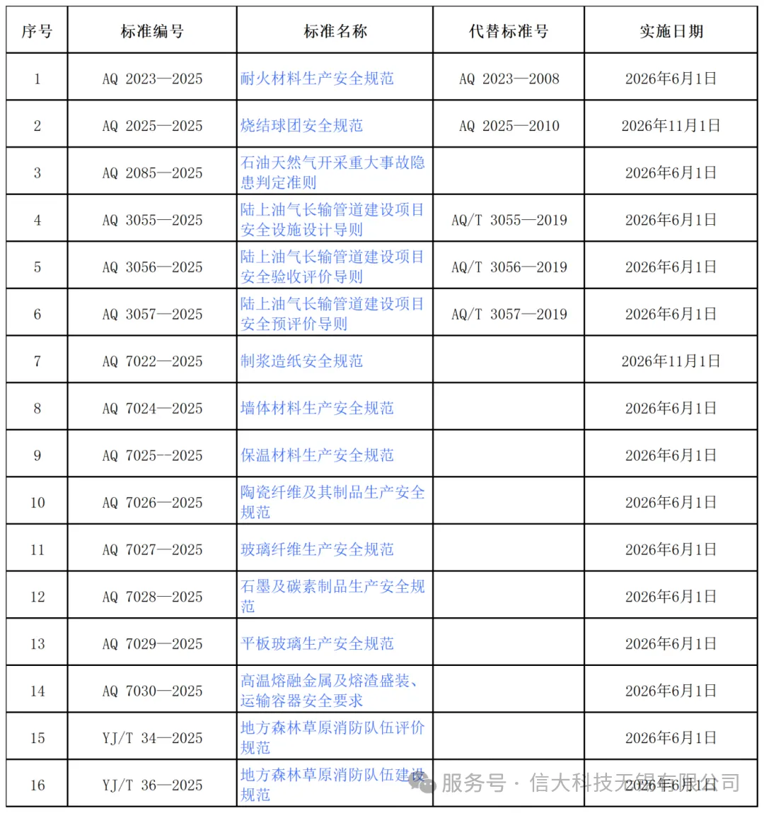 近日,应急管理部发布2025年第7号公告,批准《耐火材料生产安全规范》等16项行业标准。其中《烧结球团安全规范》与《制浆造纸安全规范》的实施日期为2026年11月1日,剩余14项行业标准实施日期为2026年6月1日。