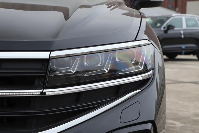 比如上市不久的2025款2.0TSI锐影版,车头造型非常帅气,作为第三代的中期改款,新车延续了R-Line版的外观造型。前格栅和进气口进一步进行加大处理,并且加入了R-Line的外观套件,让整个车头看起来甚至有些夸张,更像是一台性能车。大灯组采用矩阵式光源,车标两侧还配备了贯穿式的LED灯带,在夜间灯光全部点亮时,甚至比很多新能源车看起来更加震撼。因此在颜值方面,2025款途锐显然要比老款更胜一筹。
