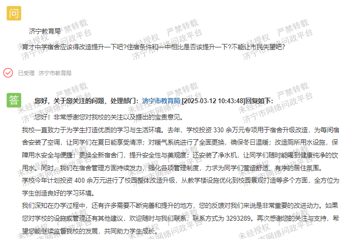 济宁市教育局回复表示,育才中学始终将学生的学习和生活环境作为重点工作之一。去年,学校投入330余万元专项资金用于宿舍升级改造,具体措施包括:为每间宿舍安装空调,确保学生在夏日能够享受清凉;全面更换暖气系统,保障冬日宿舍温暖舒适;改造厕所用水设施,提升用水安全性和便捷性;更换全新宿舍门,增强安全性和美观度;同时,还安装了净水机,为学生提供健康纯净的饮用水。此外,学校还不断加强宿舍管理,完善各项制度,努力为学生营造舒适、有序的居住环境。