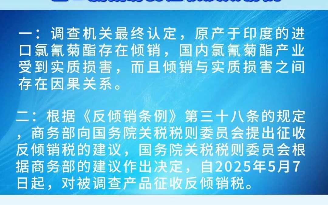 几乎同一时间,中国商务部宣布对印度氯氰菊酯实施反倾销税,税率最高达166.2%,期限5年。